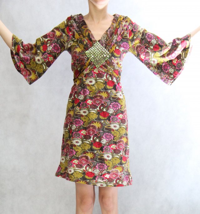 Kwiecista sukienka z bawełny (grubszej) i elastyny (5%). Rękawy 3/4, rozkloszowane.