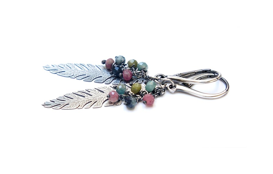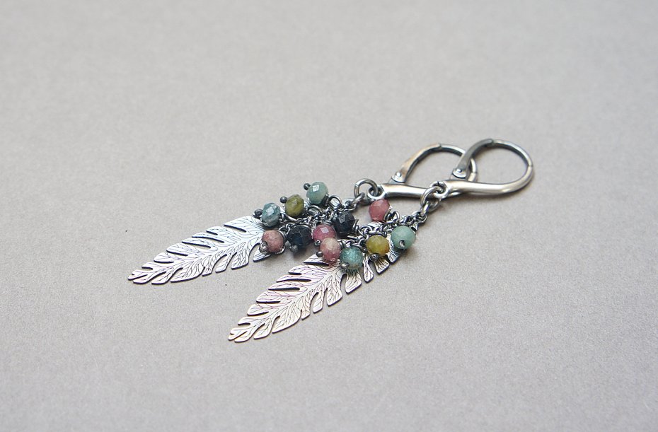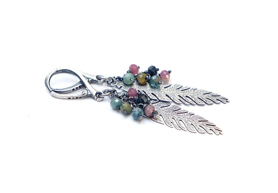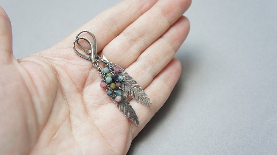 Kolczyki wykonane ze srebra [pr. 925] w połączeniu z fasetowanymi kuleczkami turmalinów [4mm] oraz srebrnymi listkami [40mm]. Całość oksydowana i przetarta. Całkowita długość kolczyków 6,2cm. Biżuteria ozdobnie zapakowana.