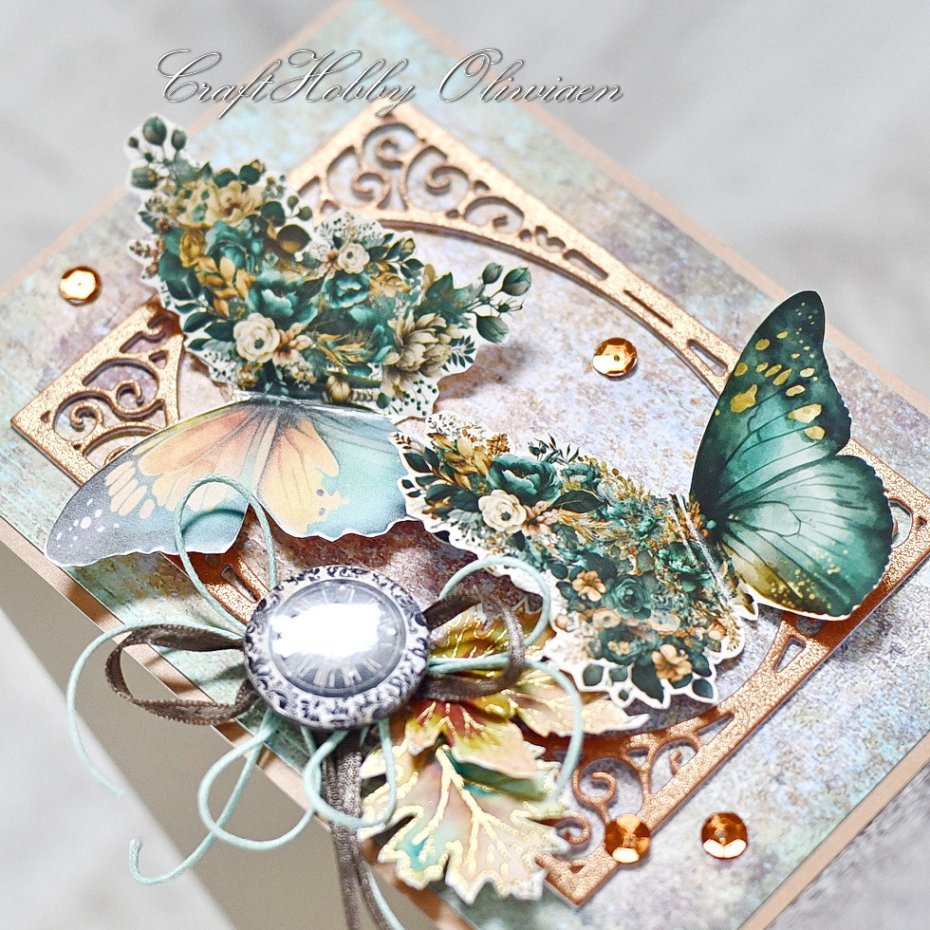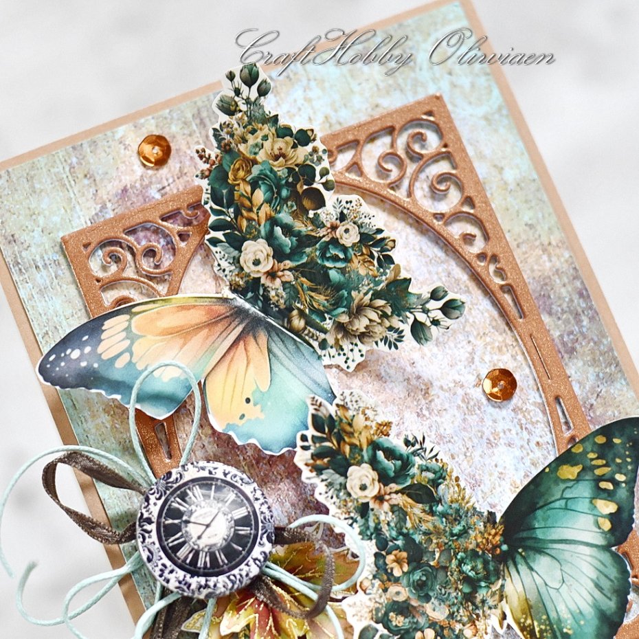 Kartka wykonana z bezkwasowych papierów do scrapbookingu, ozdobiona misterną ramką z perłowego miedzianego kartonu, wyciętymi z satynowanego papieru motylami, buttonem z motywem tarczy zegara vintage, stemplowanymi, embossowanymi i ręcznie kolorowanymi jesiennymi listkami, satynową wstążeczką, cekinami i sznureczkiem.
