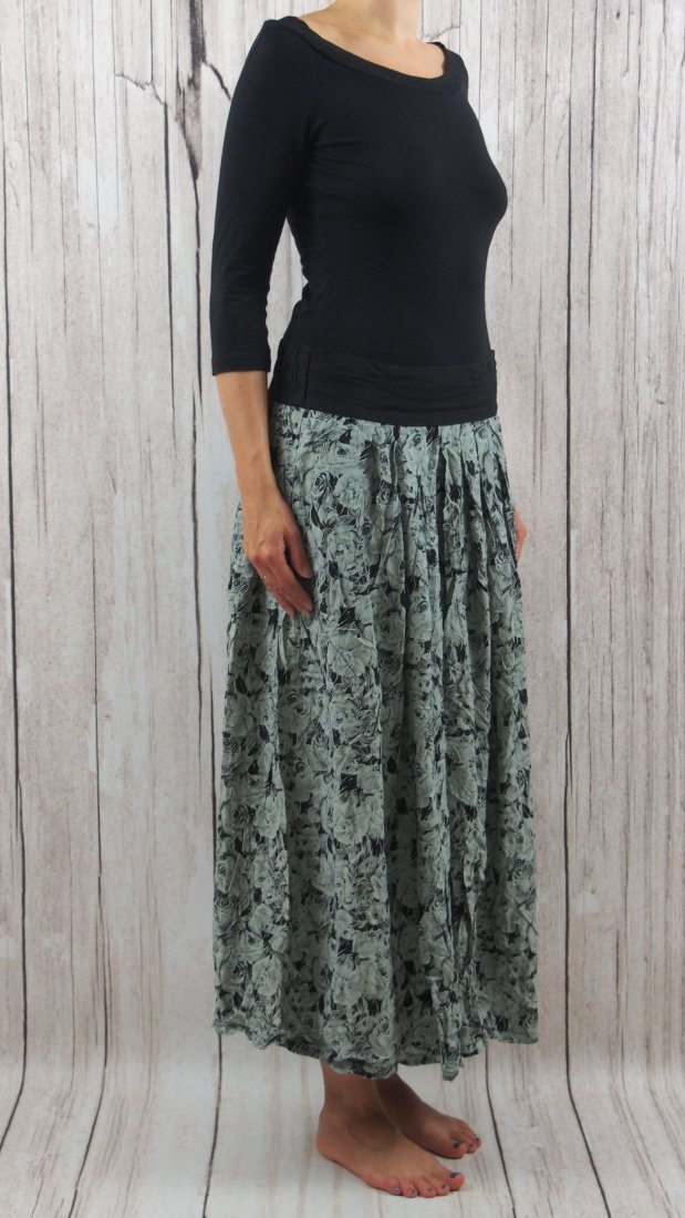 Kwiecista spódnica idealnie pasująca do długich butów typu martensy czy trampki. Sprawdzi się w jesiennych stylizacjach. Z jednej strony kieszeń, z drugiej zamek. Z tyłu w pasie guma. Marki Cartoon. Z wiskozy typu rayon (zwanej też sztucznym jedwabiem).