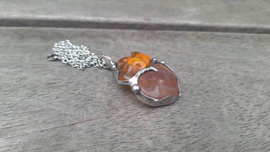 Wisiorek wykonany z miedzi, cyny, bursztynu i fluorytu. Wymiary ok. 4 na 3.5 cm. Zawieszony na łańcuszku o długości ok. 50 cm.