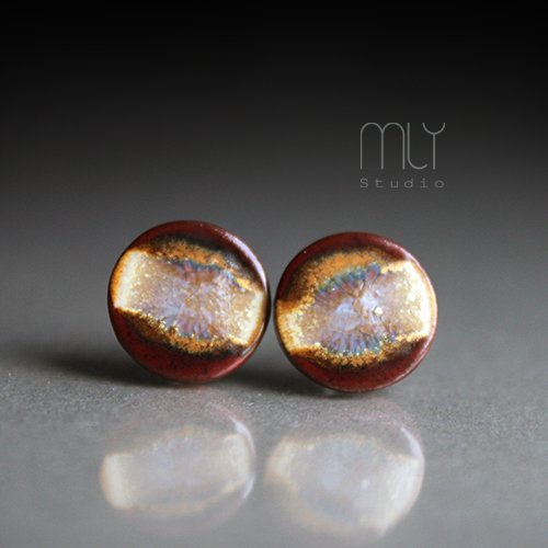 Ceramiczne, lekko nieregularne kolczyki w formie sztyftów, ręcznie wykonane z delikatnej czekoladowobrązowej gliny kamionkowej, jednostronnie szkliwione efektowną mieszanką błyszczących beżowo kremowych i bordowych szkliw z efektem plamek, na antyalergicznych sztyftach w kolorze srebrnym.Średnica ok. 11mm. Polecam