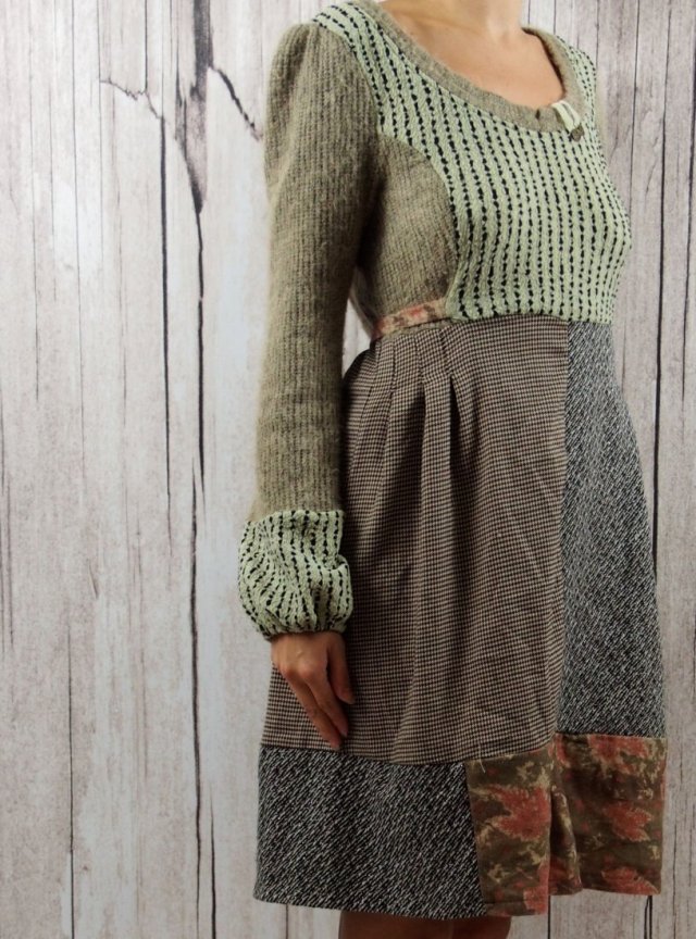 Cieplutka sukienka z patchworkowo łączonych fragmentów. Materiał: część a: akryl 65%, poliester 35%, część b: poliester 65%, wiskoza 35%,