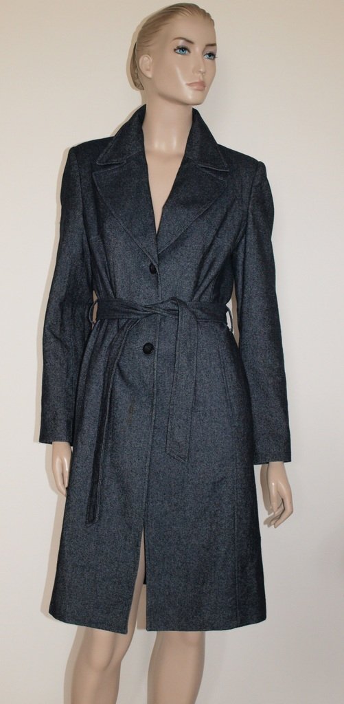 śliczny płaszczyk marki Vero Moda, w kolorze granatowym (materiał w typie pieprz z solą). Taliowany, kieszenie do wewnątrz. Stan bardzo dobry. Materiał 40% wełna, 30% bawełna 20% poliester. Rozmiar z metki M, myślę, że powinien pasować na 38. Prezentowany na manekinie o rozmiarze 38.