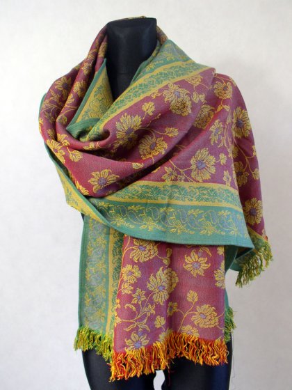 Szal dwustronny. Materiał 70% viskoza + 30% akryl.Końce zakończone frędzlami.Brzeg obrzucony maszynowo.Na środku wzór kwiatowy bordowo-żółty,brzegi zielono-żółte.Długość 170 cm.bez frędzli,szerokość 50 cm.