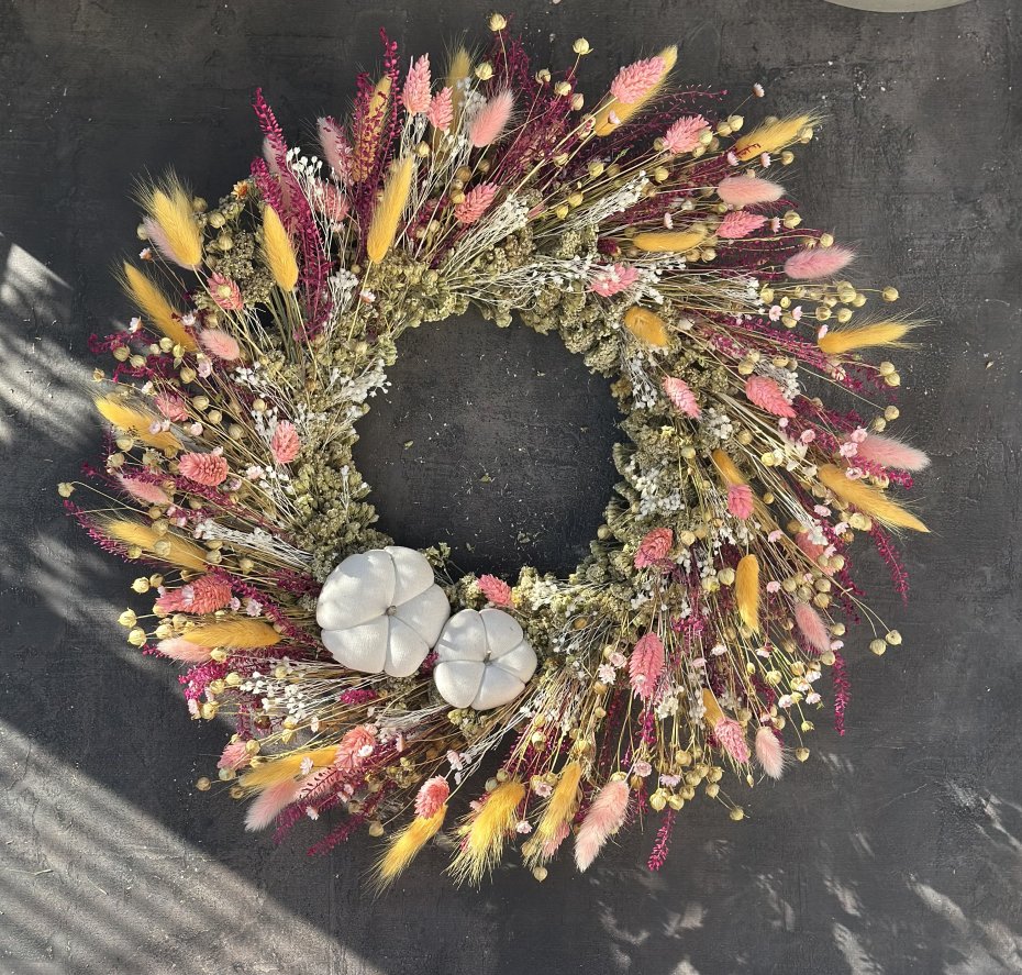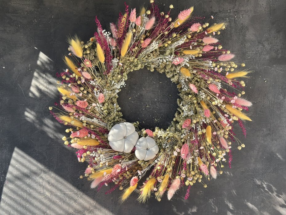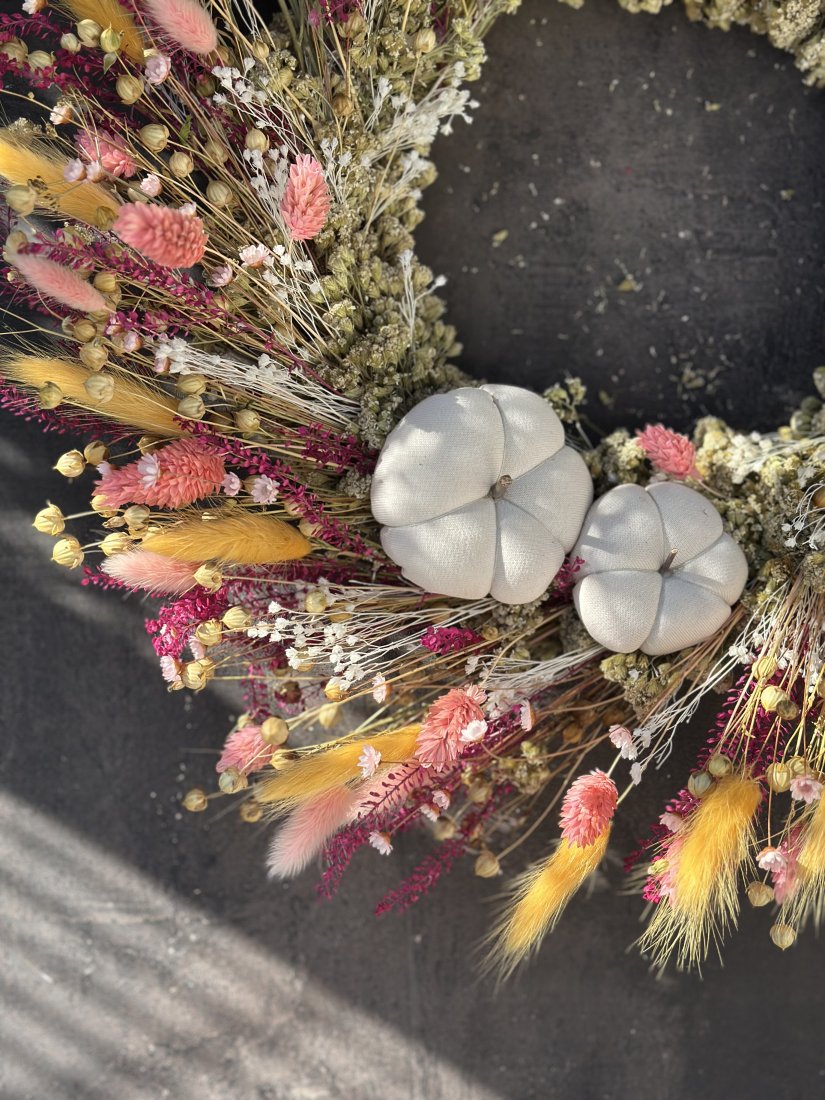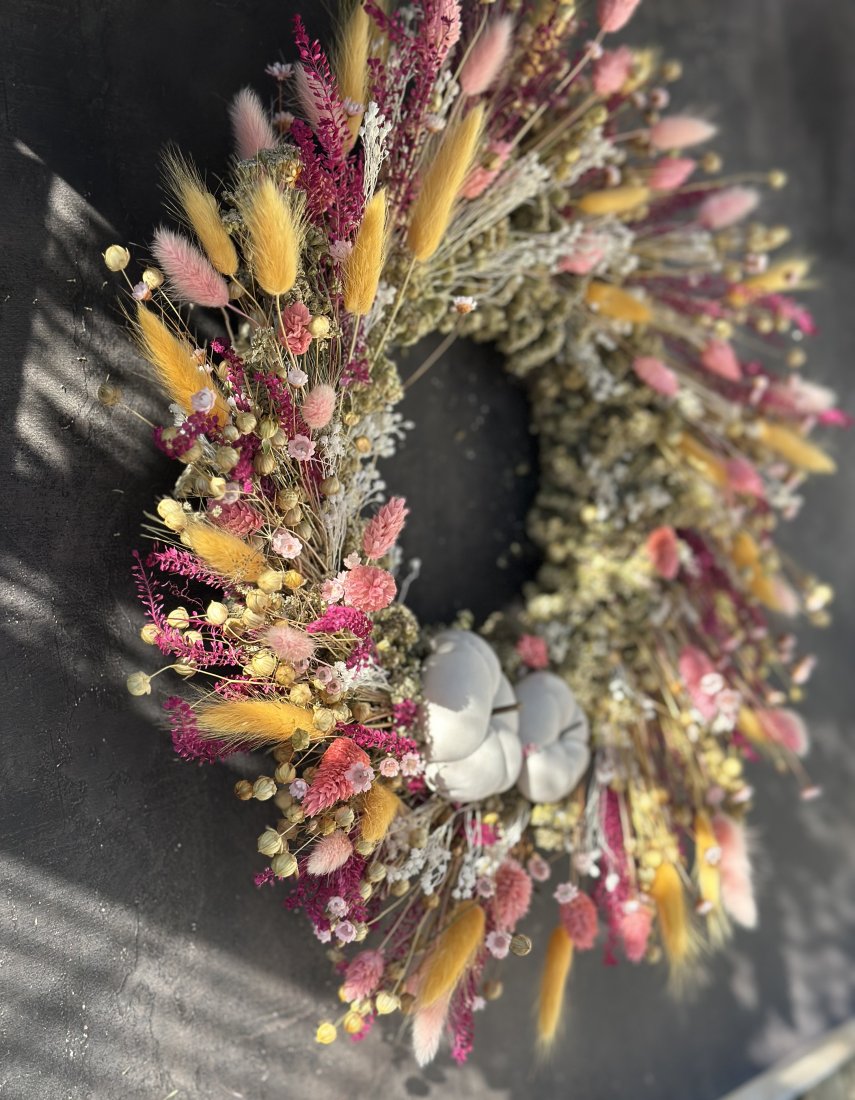 Naturalny wianek wykonany z roślin suszonych w kolorach: różowy, pomarańczowy, jasny brąz.