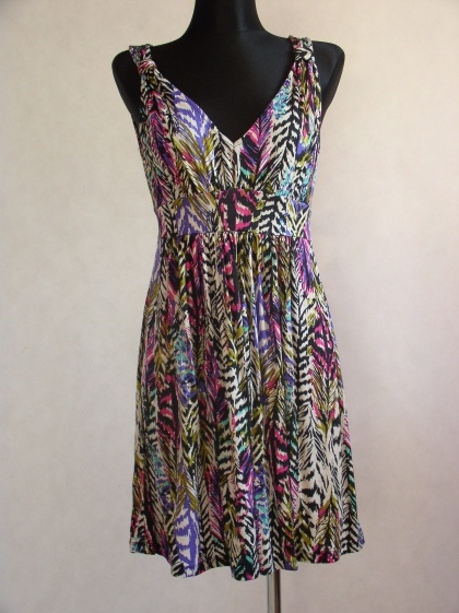 Sukienka firmy H&M.Materiał wiskoza.Pod biustem odcięta+wstawiony pas.Dekolt mocno wycięty,tył również.Ramiączka szerokie ,zmarszczone paseczkiem.Stan bardzo dobry-.Długość 92 cm,pod pachami 102 cm,pas 72 cm.