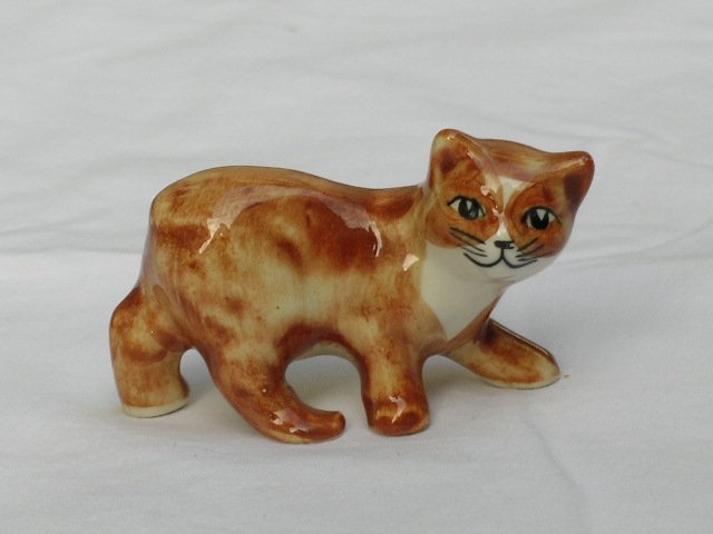 Porcelanowy kotek. Lekki, uśmiechnięty, ręcznie malowany i na błyszcząco szkliwiony. Do kolekcji :) 8 x 3,5 x 4 cm. Stan zachowania bardzo dobry.