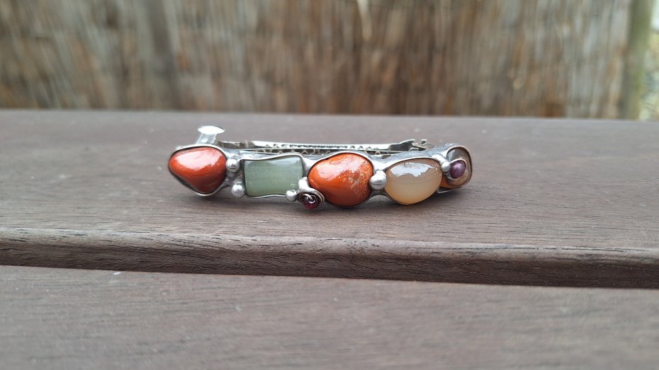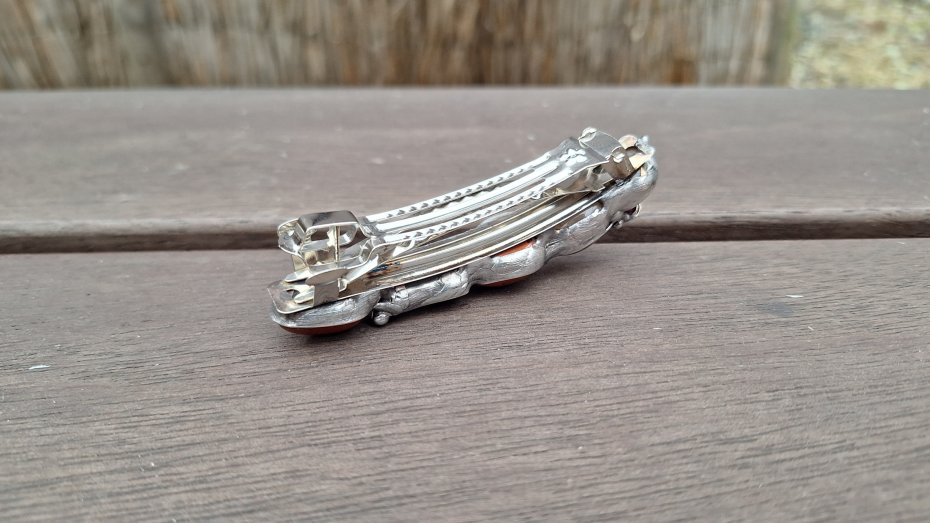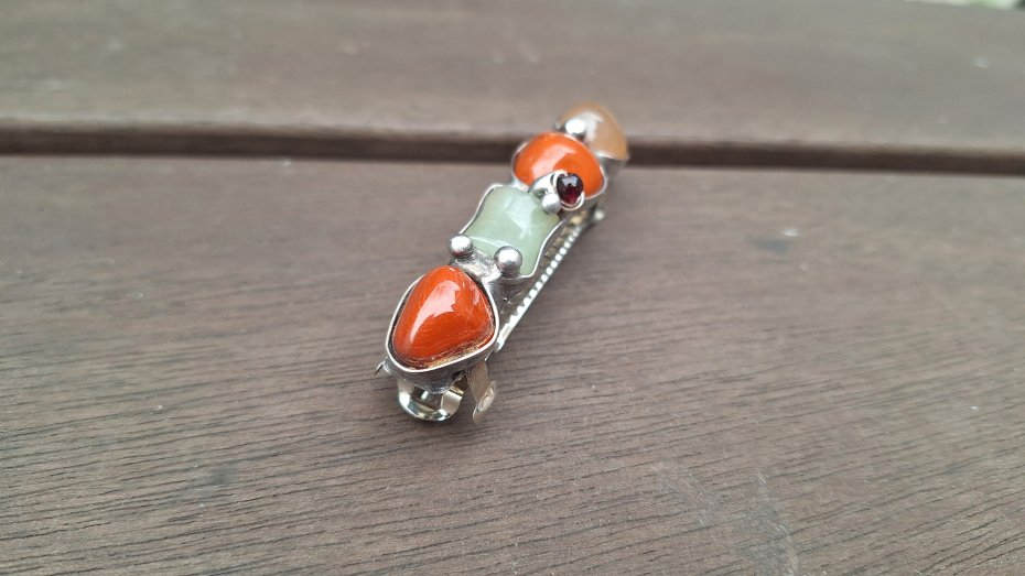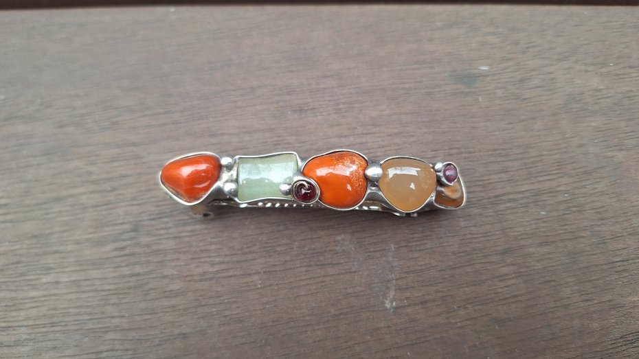 Klamra do włosów, wykonana z miedzi, cyny, granatów, jaspisów i agatów. Wymiary ok. 8 na 1.5 cm. Zapięcie 6 cm, metalowe.