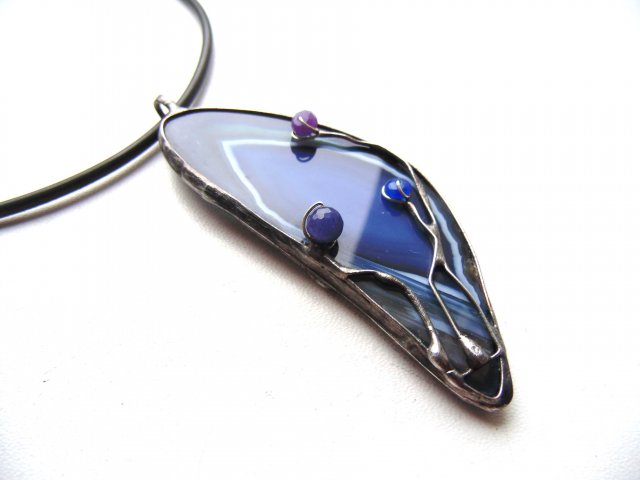Wisiorek wykonany techniką witrażową z miedzi, cyny, agatu i jadeitów. Zawieszony na czarnej lince kauczukowej o długości ok. 45 cm. Wymiary ok. 8,5 na 3 cm.
