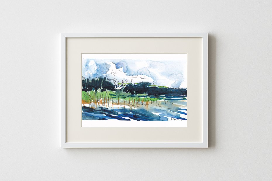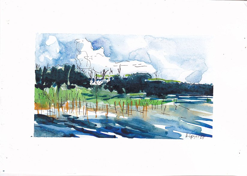 Pejzaż akwarelowy pełen światła i przestrzeni, ukazujący fragment nadwodnego krajobrazu. Swobodna, szkicowa linia i lekkie przejścia barwne oddają ulotność chwili – odbicia nieba w wodzie, zielenie traw i trzcin, a w tle ciemniejszy pas drzew. Kompozycja łączy spontaniczność plamy z precyzją obserwacji natury, tworząc wrażenie harmonii między ruchem, światłem i ciszą.