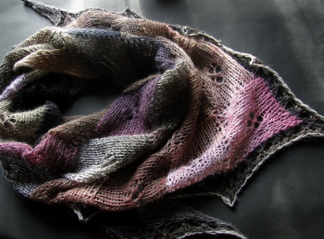 Niebanalna chusta, delikatna i zwiewna,która może służyć cały rok: jako ochrona przed chłodem lub element stylizacji. Wykonana ręcznie na drutach . kolory przepięknie przechodzą od ecru do kawy, gorzkiej czekolady, poprzez rozbieloną jeżynę i oliwkę. Niestety zdjęcia nie oddają delikatności, miękkości i pięknych niuansów kolorystycznych. Wymiary: 220 (najdłuższy bok) x 82 (wysokość trójkąta) cm. Skład: 75% wełna, 25% poliamid. Polecam serdecznie.