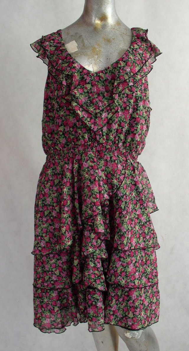 Sukienka w kwiatki firmy JOE BROWNS.Rozmiar 22,nasz 50.Materiał polyester.Podszewka czarna,syntetyk.Zapinana z boku na zamek.Odcięta w pasie+marszczona gumkami.Dekolt ozdobiony dwoma falbankami.Dół z naszytymi na podszewkę falbanami.Stan bardzo dobry.Długość 106 cm.pod pachami 132 cm.