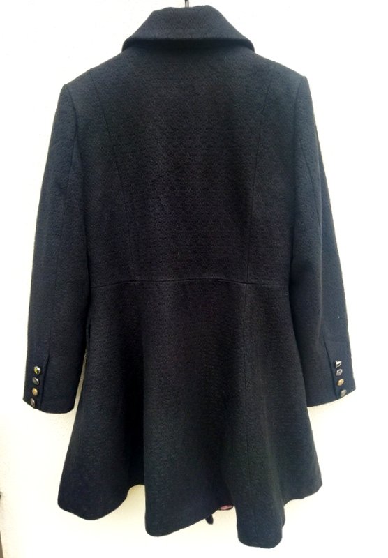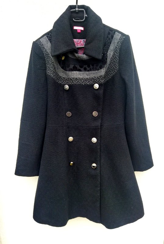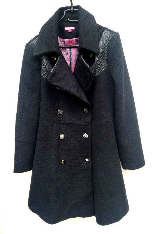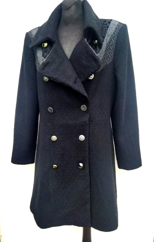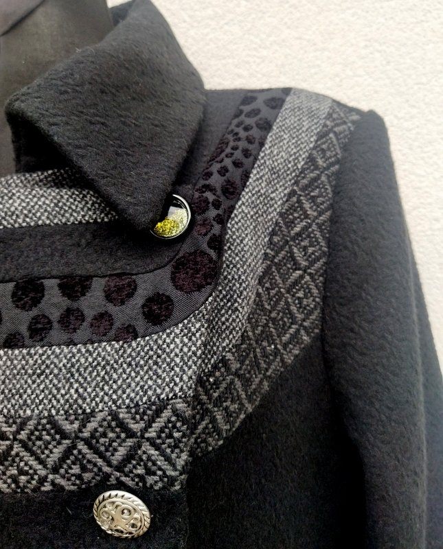 Atrakcyjny płaszcz z czarnej tkaniny z fakturą łączonej z czarno -szarymi wstawkami . Odcinany w pasie, z kołnierzem, z dwiema wpuszczanymi kieszeniami , dół trapezowy , dwurzędowy zapinany na różnorakie oryginalne ozdobne guziki. Całość na eleganckiej wzorzystej podszewce.
