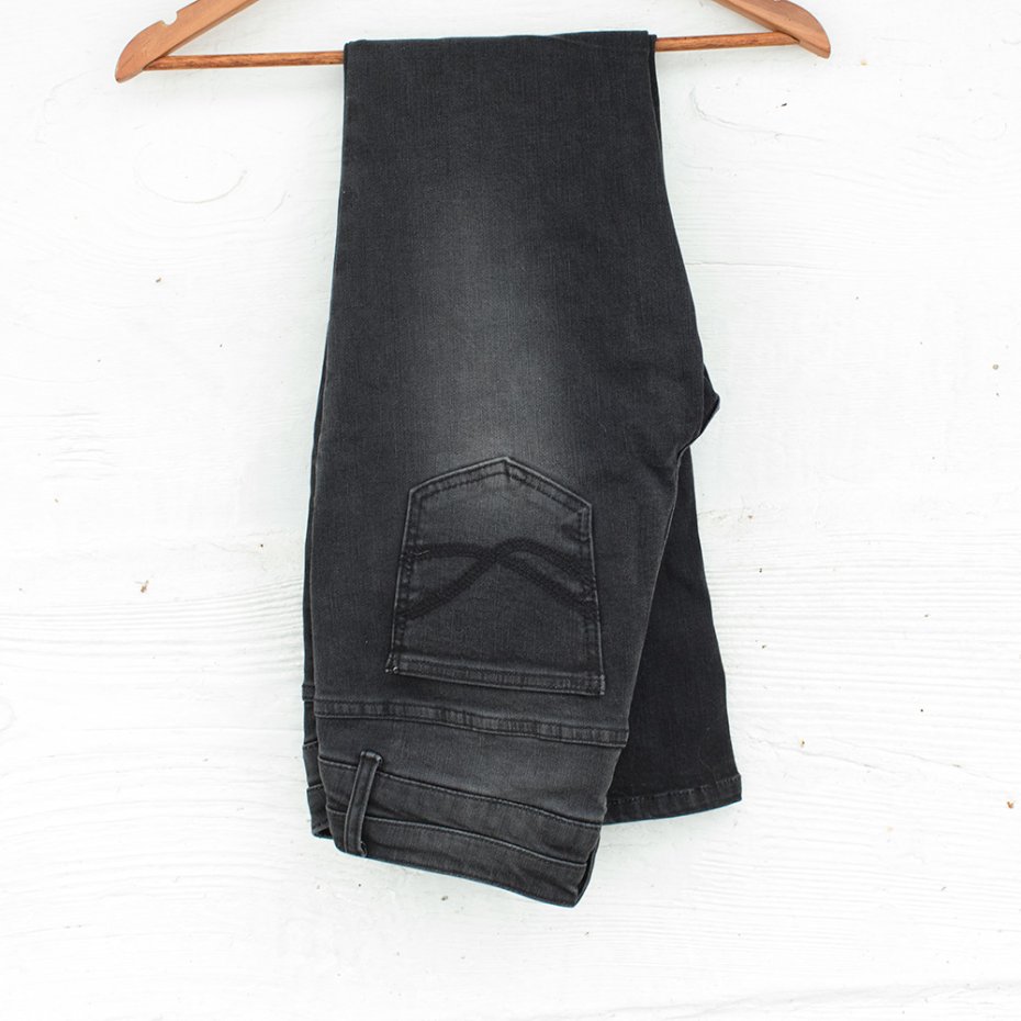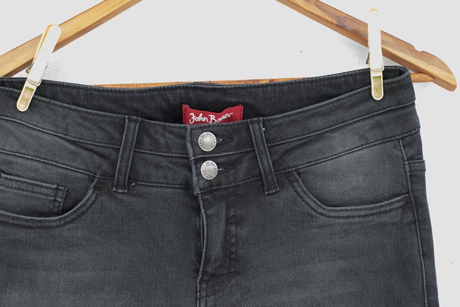 5 kieszeni, zapinanie na dwa guziki i ekspres.