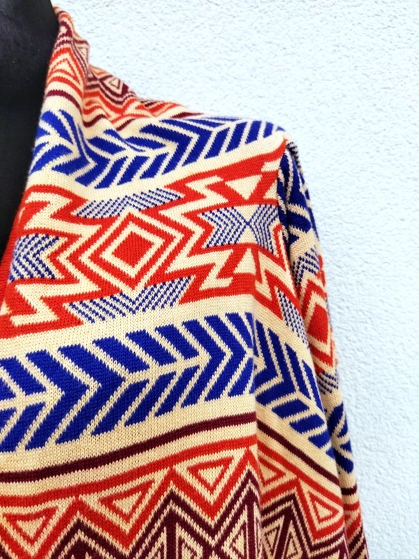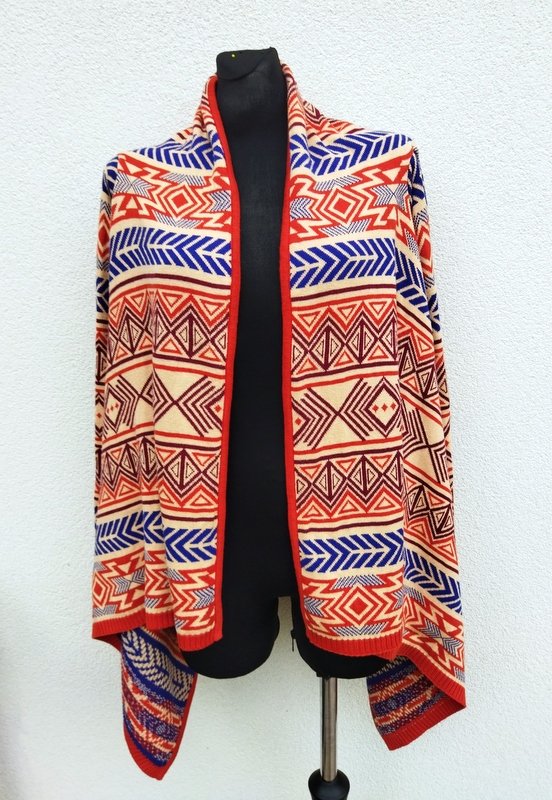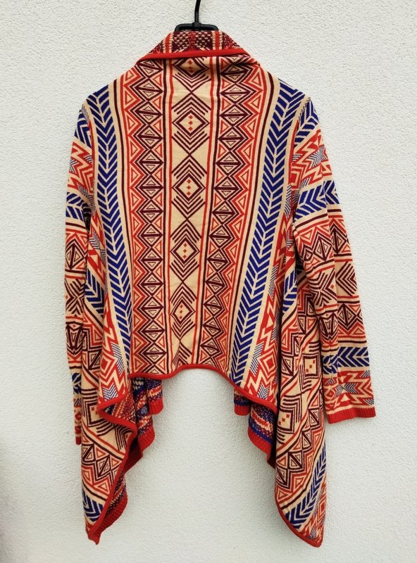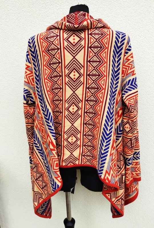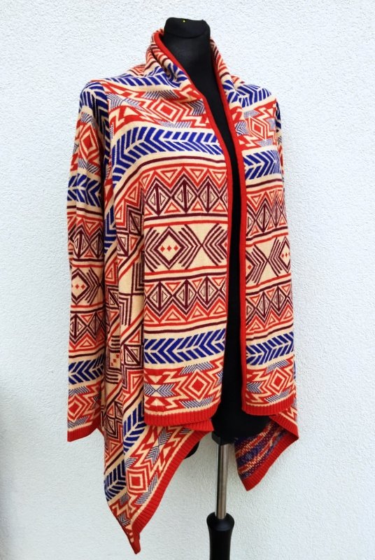 Wzorzysty żakardowy bawełniano-akrylowy sweter w kolorystyce rudości, kobaltu, burgundu i słomkowej żółci z połami przodu zachodzącymi na siebie aż do przeciwległego boku - opuszczone swobodnie w dół nadają mu asymetrycznego wyglądu. Bezszwowy w kształcie prostokąta z wszywanymi rękawami. Miły , dobrej jakości.