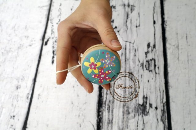 Ręcznie malowane drewniane jojo jak za dawnych lat. Średnica wynosi 5 cm.