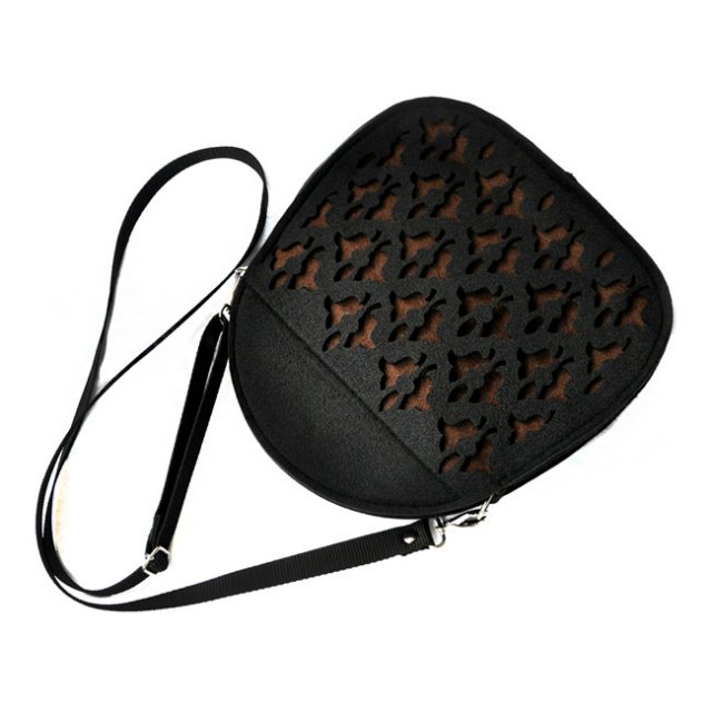 Mały kuferek na pasku z regulacją długości. Uszyty z grubego i sztywnego filcu czarnego jednostronnie impregnowanego. Wszystkie części konstrukcji wycięte techniką laserową. Wzór na przodzie torebki został zaczerpnięty ze skórzanych bransoletek. Ażur jest podszyty filcem w kolorze brązowym. Torebka zamykana na zamek i nap jest przeznaczona do noszenia na skos jako listonoszka. We wnętrzu znajduje się kieszeń zapinana na zamek. Wymiary torebki : wysokość mierzona przez środek 29cm, szerokość w najszerszym miejscu 28cm, głębokość dna 7cm. Na ostatnim zdjęciu porównanie wielkości z dużym kufrem.