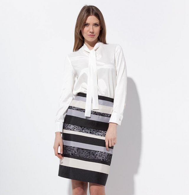 Paski szare i kremowe są z jedwabiu, czarne z atłasu a paski koronkowe są jedwabne z welurowym wzorkiem. Całość na wiskozowej podszewce. przód i tył dopasowane zakładkami, jedno cięcie na tyle, zamek kryty.