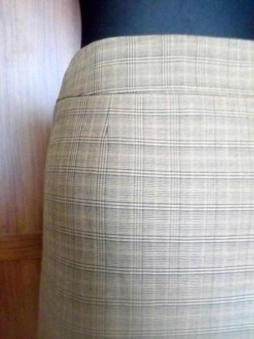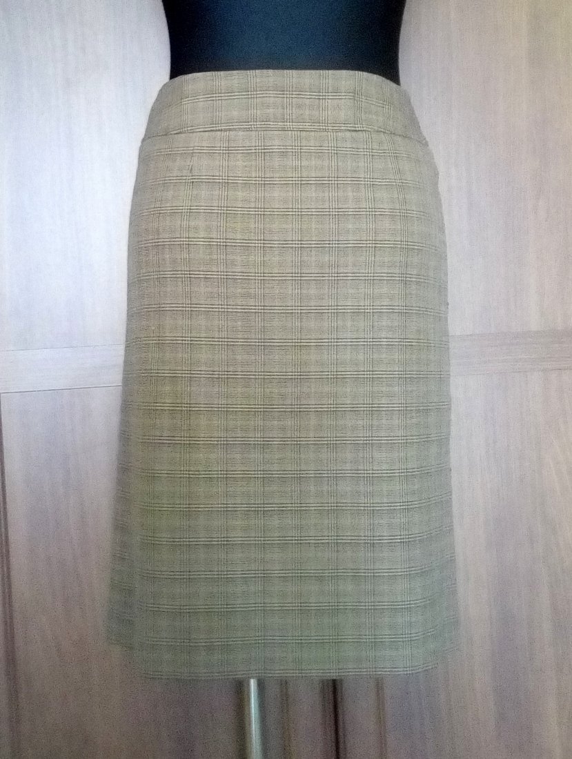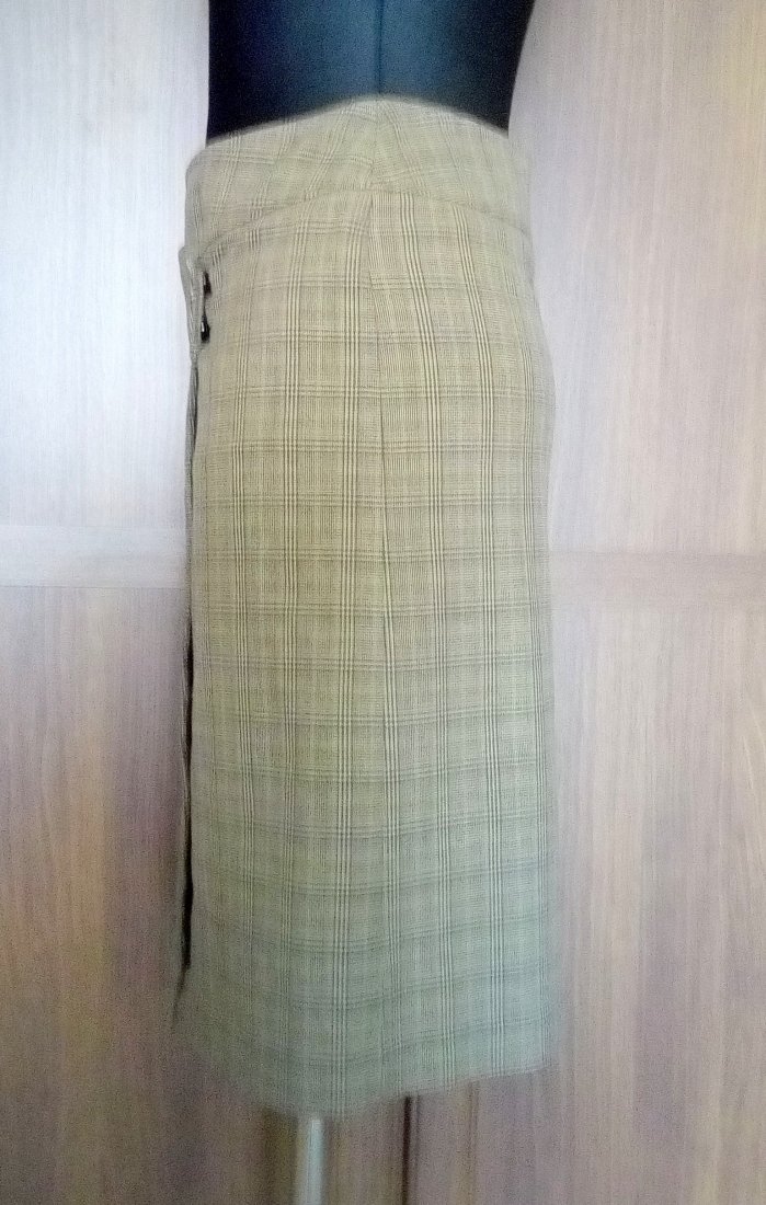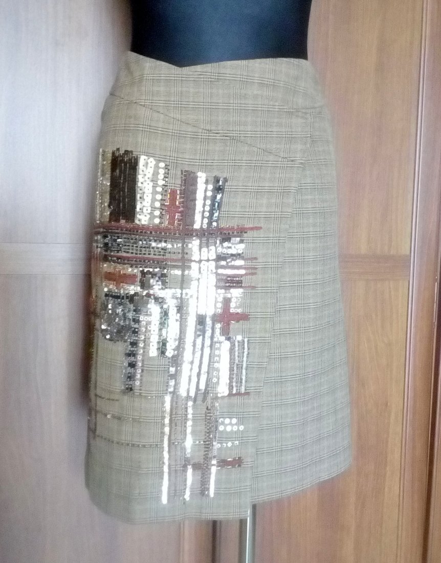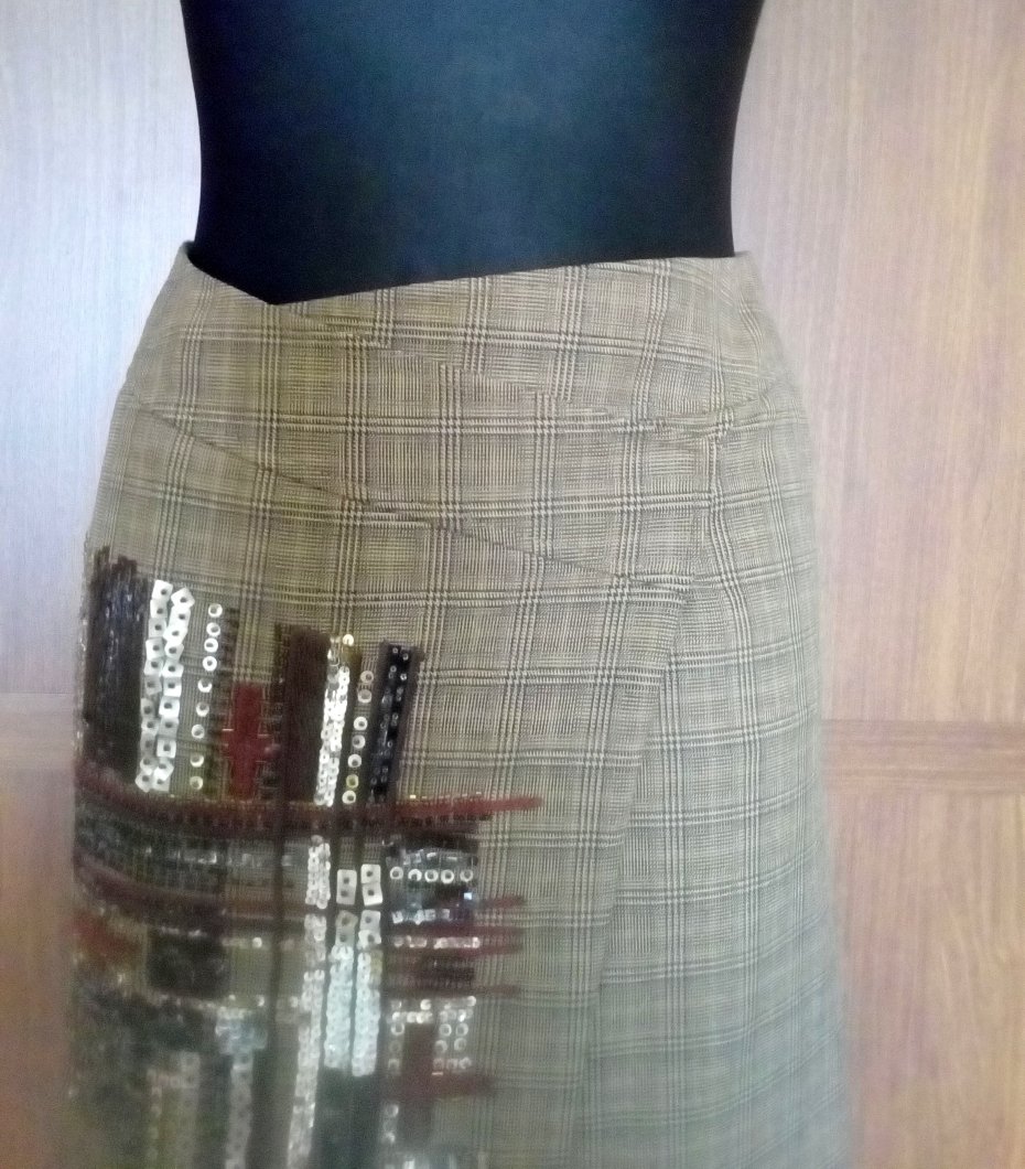 Ciekawa spódnica w kratę, zdobiona na przodzie haftami, cekinami, koralikami, wszystko dopasowane kolorystycznie. Spódnica zakładana kopertowo na przodzie z zapięciem na zatrzaski, poły mocno zachodzą na siebie, od środka na brązowej podszewce