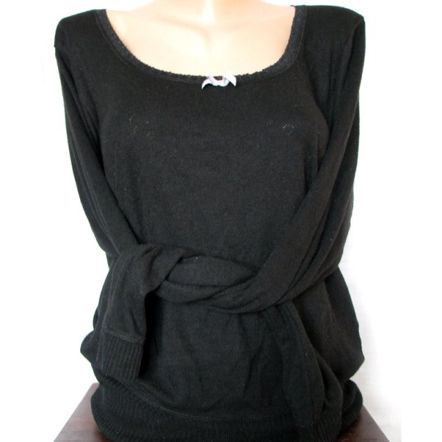 Czarny sweterek o prostym kroju firmy JOOP! w delikatny ażurkowy wzorek z okrągłym dekoltem wykończonym delikatną koronką oraz małą kokardką w centralnej części dekoltu. Wymiary na płasko: biust 47 cm, talia 42cm. Długość mierzona przodem od ramienia 81 cm. Długość mierzona po wewnętrznej stronie rękawa 55 cm, od ramienia 62 cm. Sweterek rozciągliwy, dopasowuje się do sylwetki.