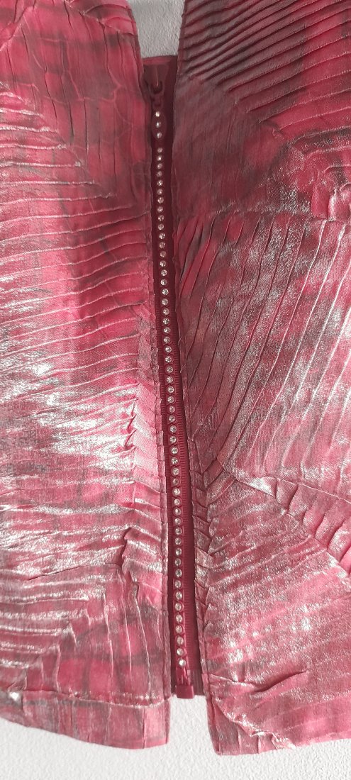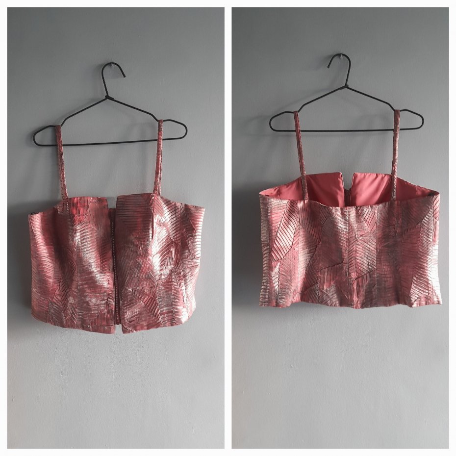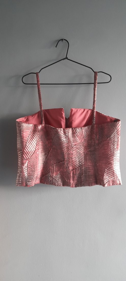 Niezwykle efektowny,ekskluzywny ,projektancki , gorset w idealnym stanie, zapinany z przodu na zamek z dżetami, fakturowa mięsista tkanina, perfekcyjnie odszyty,rozmiar z metki42/ francuskie 44, biust 102/104, dół 100, usztywniane miski