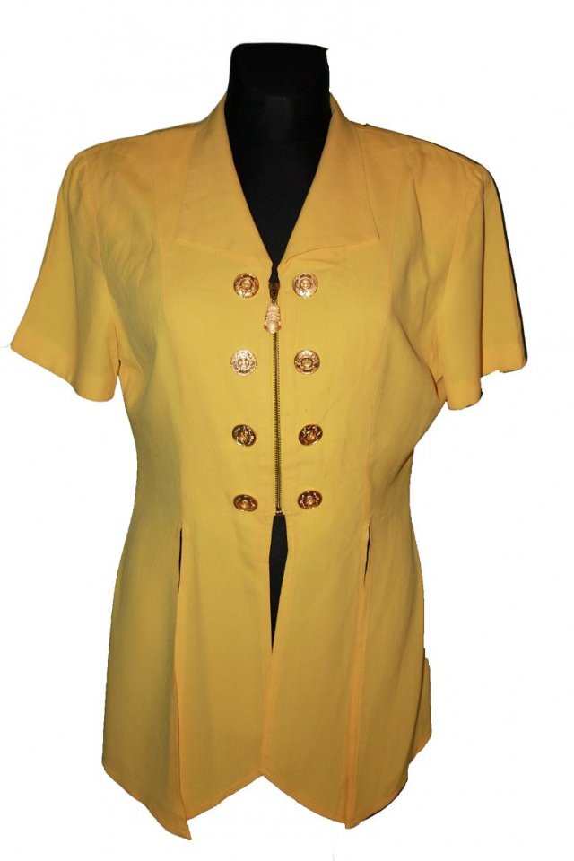 niezwykle oryginalna tunika-bluzka vintage by Joseph Ribkoff, piękny słoneczny kolor, rozcięcia nadające lekkości, efektowne zapięcie na suwak + ozdobne guziki w kolorze złota, kołnierzyk, krótki rękawek, w ramionach poduszki