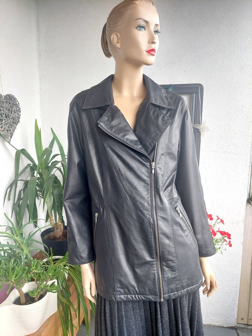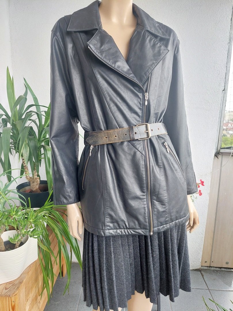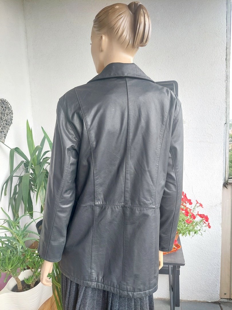 kurtka vintage marki Joy z miękkiej skóry naturalnej w typie dłuższa ramoneska. skóra w bardzo dobrym bez przetarć (mogą być gdzieś mikroślady normalnego użytkowania). są szlufki, brak paska. w ramionach małe poduszki, zapięcie na zamek. kolor czarny. Rozmiar z metki 34, proszę sugerować się wymiarami, Na manekinie o rozmiarze 38.