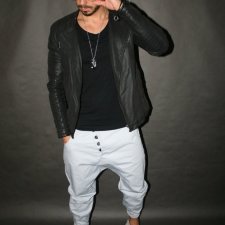 Sportowe spodnie z lekko obniżonym krokiem zakończone ściągaczem na dole i zawiązywane w pasie na sznurek. Świetnie się noszą zarówno t-shirtem, jak i marynarką.