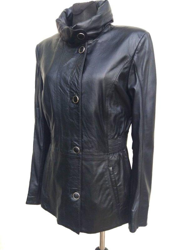 Świetnej jakości kurtka z mięciutkiej naturalnej skóry licowej w czarnym kolorze. Staranie uszyta i wykończona. Pod szyją kołnierz typu wyższa puchata stójka , dwie wpuszczane kieszenie w szwach środkowych, w talii ściągacz z tej samej skóry. zapinana na oblekane skóra guziki w złotej otoczce. Całość na podszewce z dwiema ukrytymi kieszeniami. Lekka i mięciutka zapewnia duży komfort w noszeniu.
