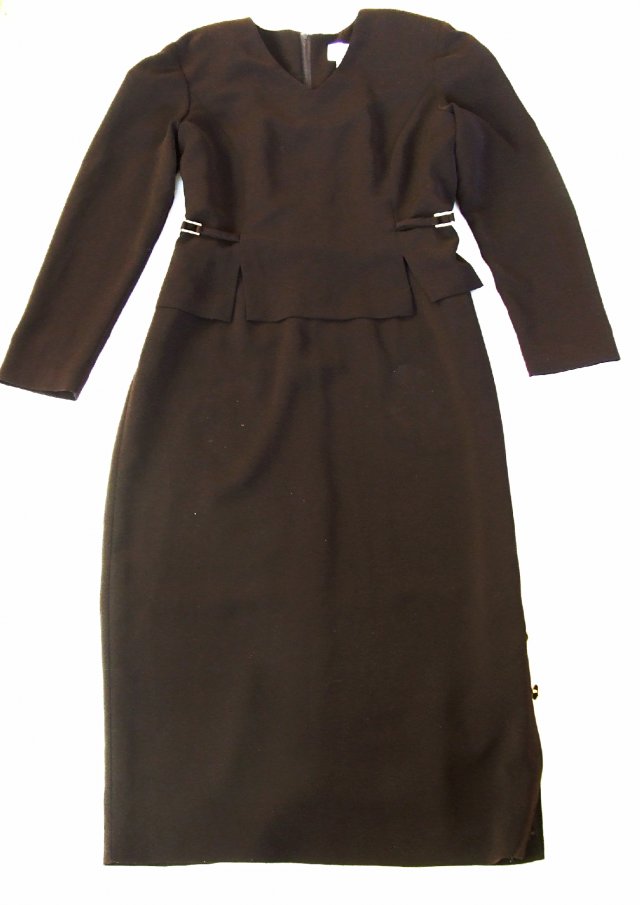 Wyjątkowa kobieca sukienka w kolorze czekoladowego brązu, podkreślająca kobieca sylwetkę. Posiada widoczne wcięcie w talii zaakcentowane dwiema złotymi sprzączkami. Dodatkowym atutem jest delikatna baskinka, która zatuszuje wystający brzuszek ;) Z boku sukienka ozdobiona jest złotymi guzikami, posiada też niewielkie rozcięcie z boku. Z tyłu zapinana jest na zamek, w ramionach wszyte są poduszki, które w każdej chwili można wypruć. Piękna elegancka i kobieca sukienka.