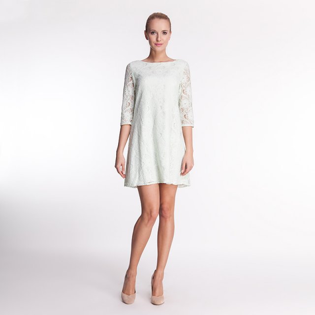Tunika z lekko poszerzonym dołem w kształcie trapezu uszyta z bawełnianej koronki w kolorze jasnej mięty, na podszewce ecru. Rękaw 3/4, dekolt łódka. Bardzo leciutka i komfortowa w noszeniu, prześliczna. Polecam :)