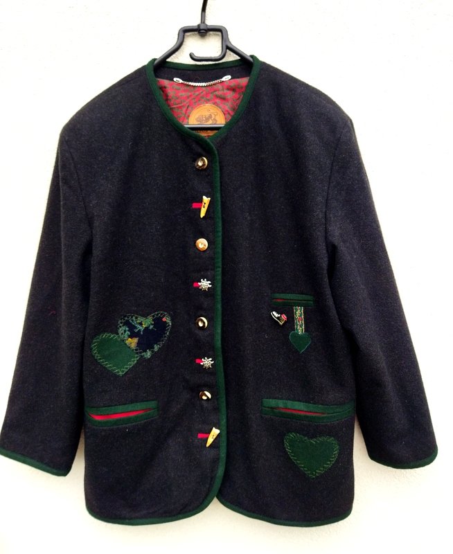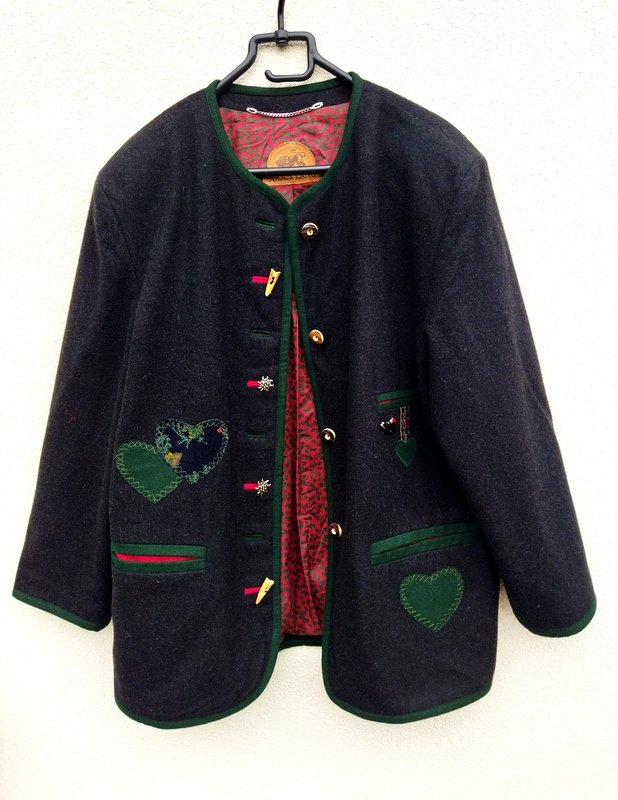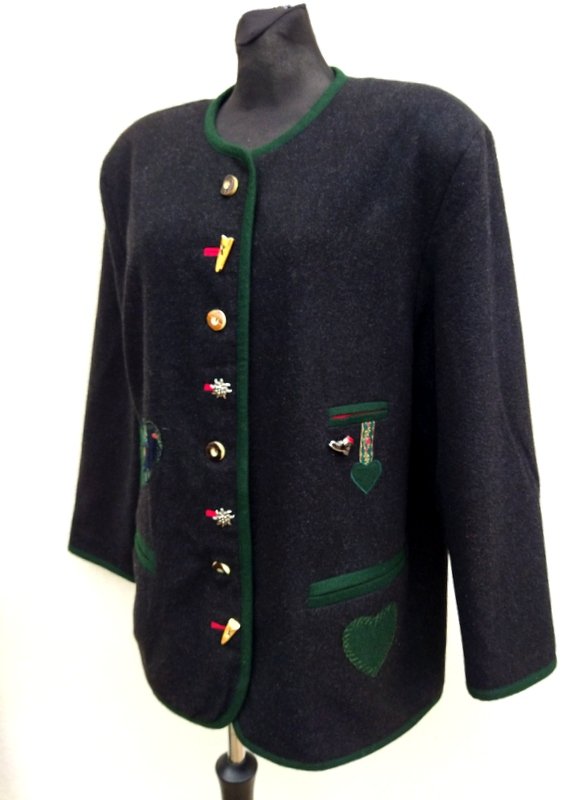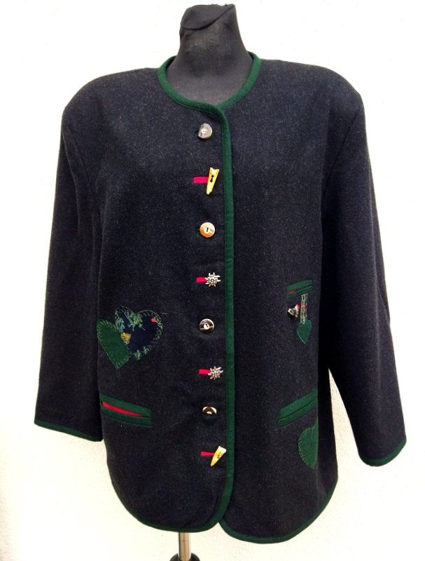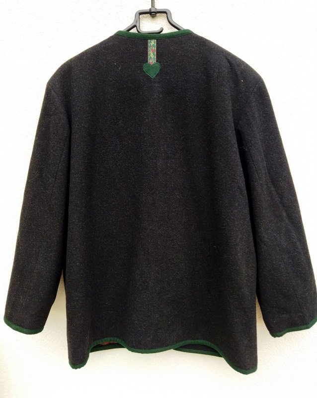 Ciekawa kurtka z wełnianej tkaniny w czarnym kolorze z ciemnozielonymi lamówkami i czerwonymi elementami wykończeniowymi; obszycia dziurek, podszycia wnętrza kieszeni. Minimalistyczny krój z dwiema wpuszczanymi kieszeniami i ozdobnymi tyrolskimi aplikacjami, zawieszką w kształcie buta i metalowymi guzikami w kształcie szarotek. Zapinana na okrągłe rogowe guziki . Całość na wzorzystej bawełnianej podszewce