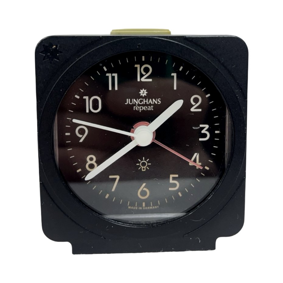 Kolekcjonerski budzik Junghans Repeat, renomowanej niemieckiej manufaktury zegarmistrzowskiej. Obudowa w kolorze czarnym, o geometrycznej, modernistycznej formie, kontrastuje z ciemną tarczą w odcieniu grafitowo-brązowym. Jasne, wyraźne cyfry oraz wskazówki zapewniają doskonałą czytelność. Model wyposażony w funkcję repeat (powtórzenie alarmu) oraz podświetlenie tarczy, co było charakterystyczne dla wysokiej klasy budzików z II połowy XX wieku. Mechanizm kwarcowy gwarantuje precyzję chodu. Przedmiot poszukiwany przez kolekcjonerów niemieckiego designu użytkowego i marki Junghans.
