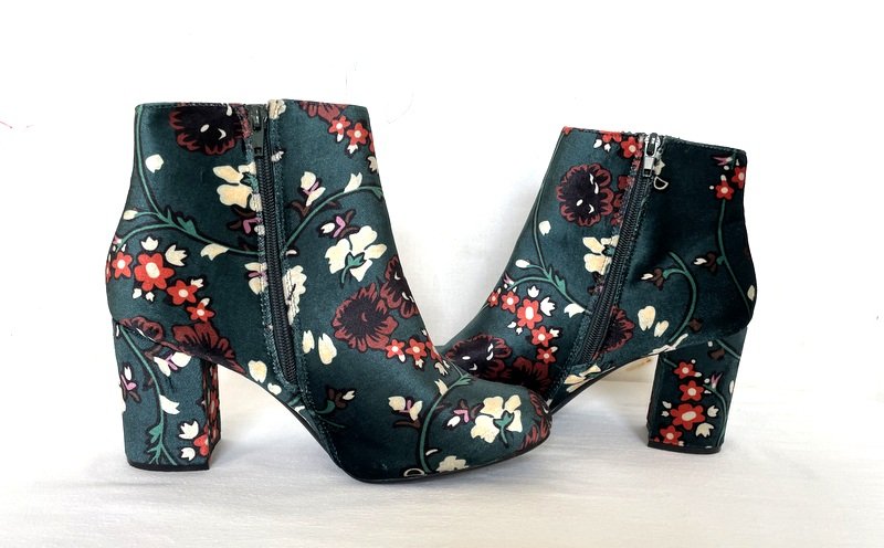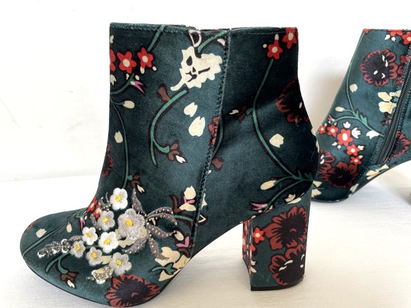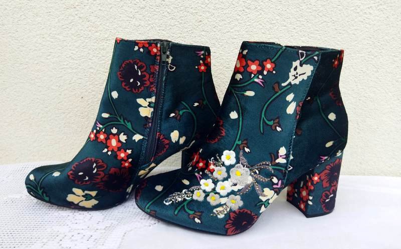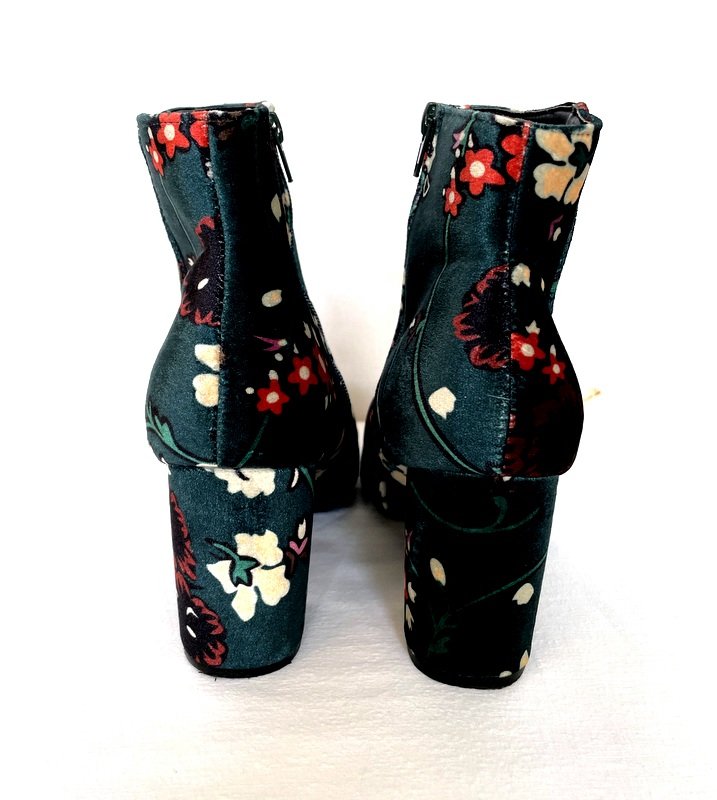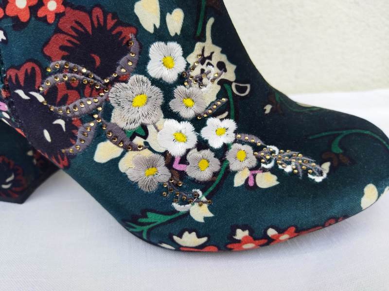 Welurowe botki w kolorze morskiej zieleni z kolorowym wzorem kwiatowymi z miejscowym haftem . Zapinane na zamek. Na stabilnym słupkowym obcasie.