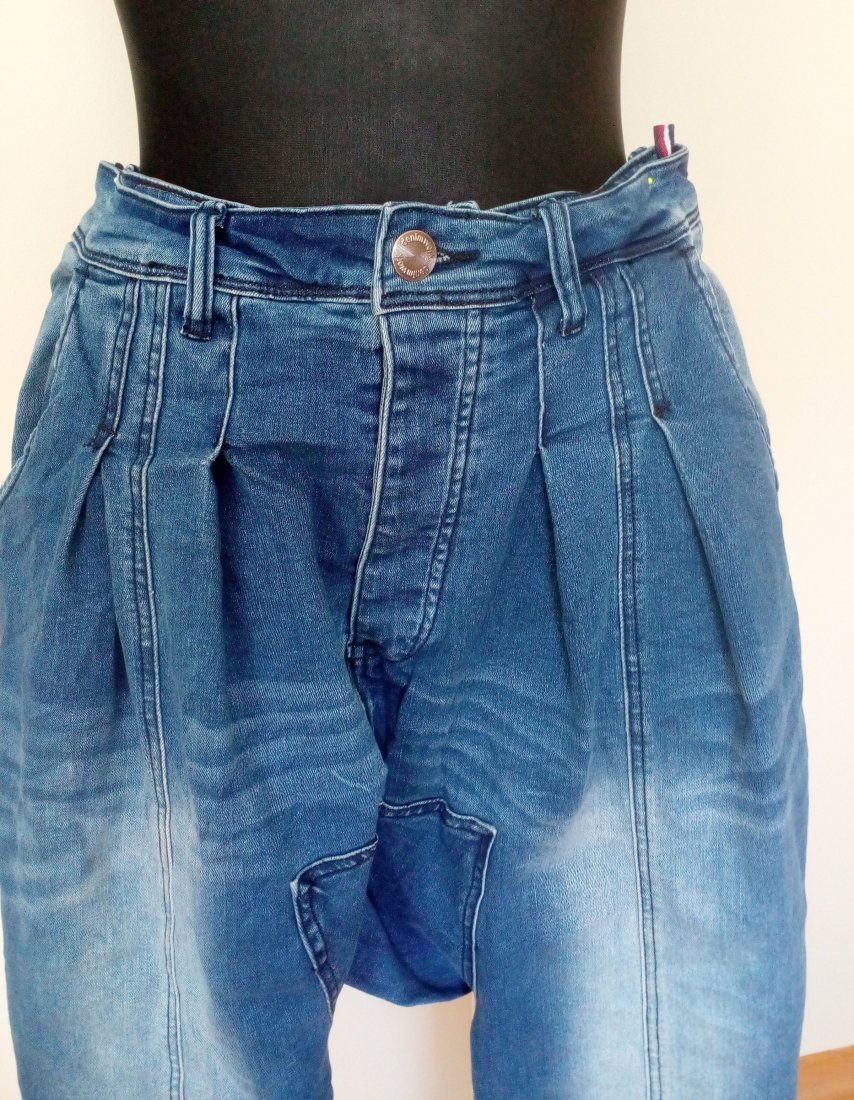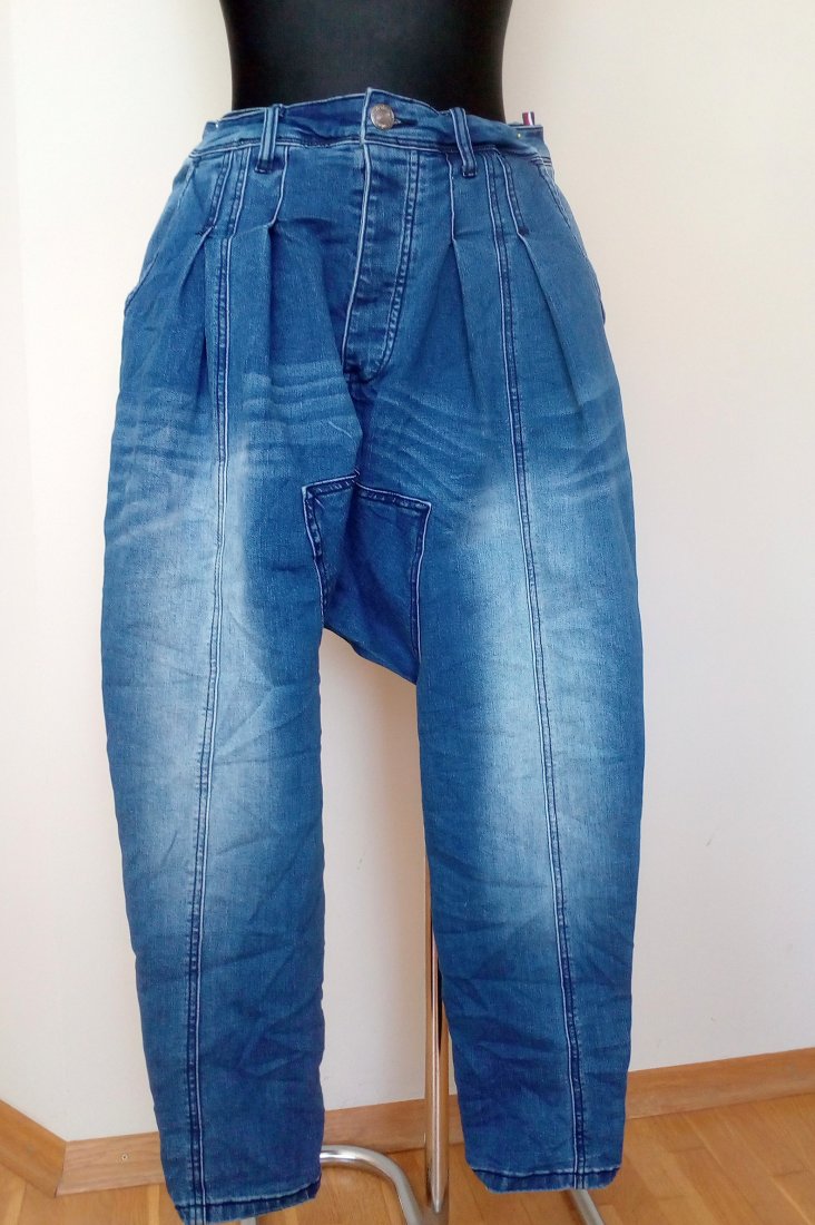 Niebieskie jeansy z obniżanym krokiem, nogawki przecierane, cztery kieszenie - dwie z przodu, dwie z tyłu, rozporek zapinany na metalowe guziki