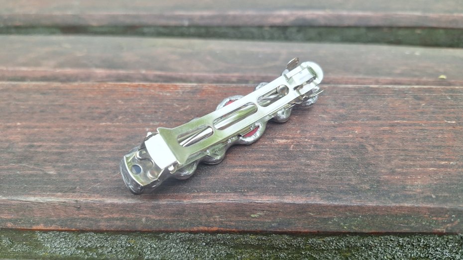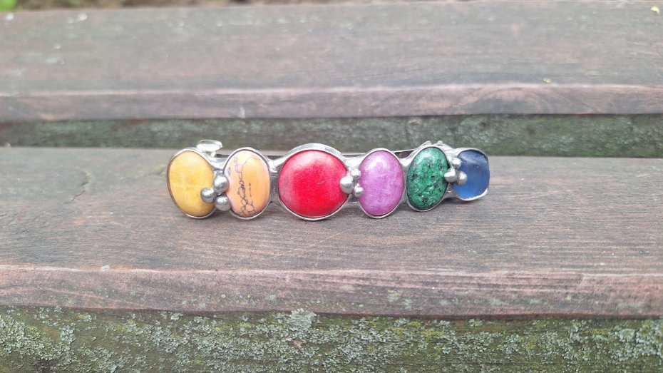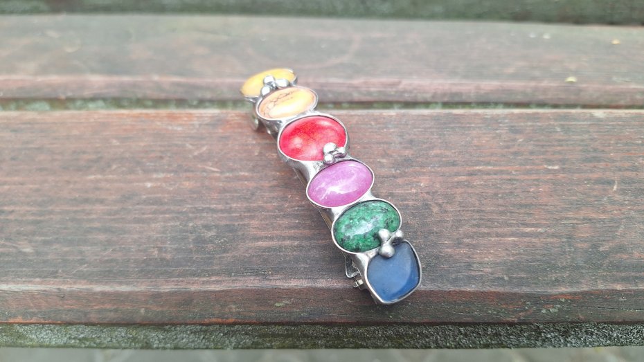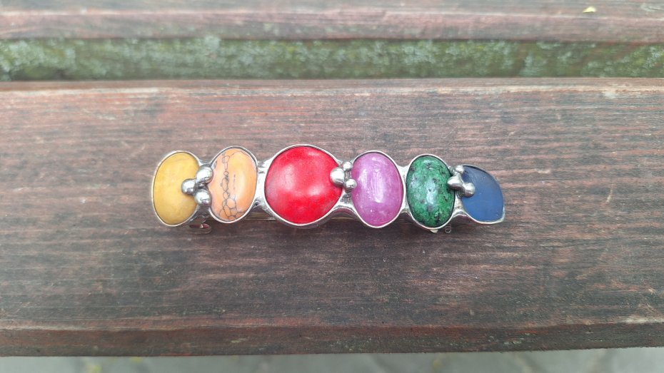 Klamra do włosów, wykonana z miedzi, cyny, howlitu, zoisytu, szkła, jaspisu i jadeitu. Metalowe, automatyczne zapięcie. Wymiary ok. 8 na 2 cm. Zapięcie ok. 6 cm.