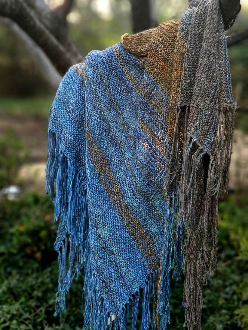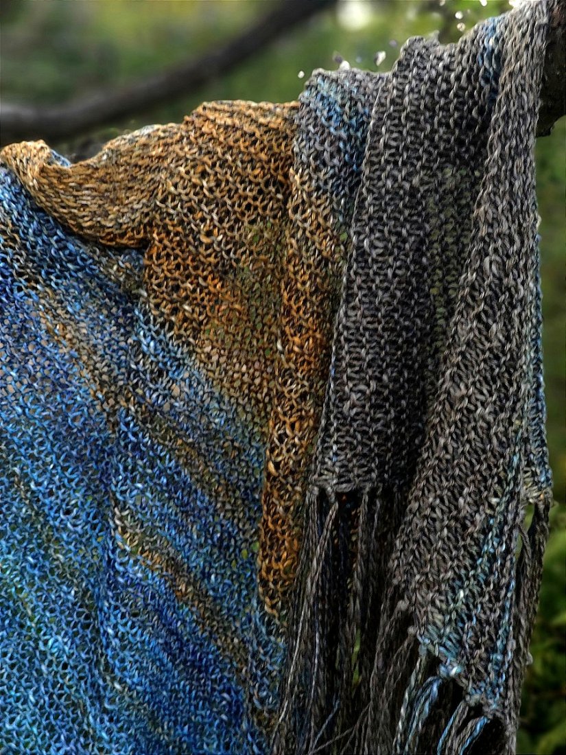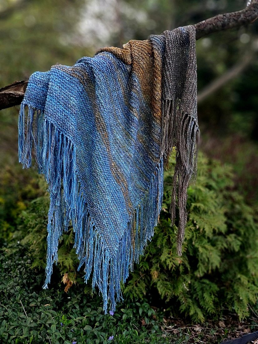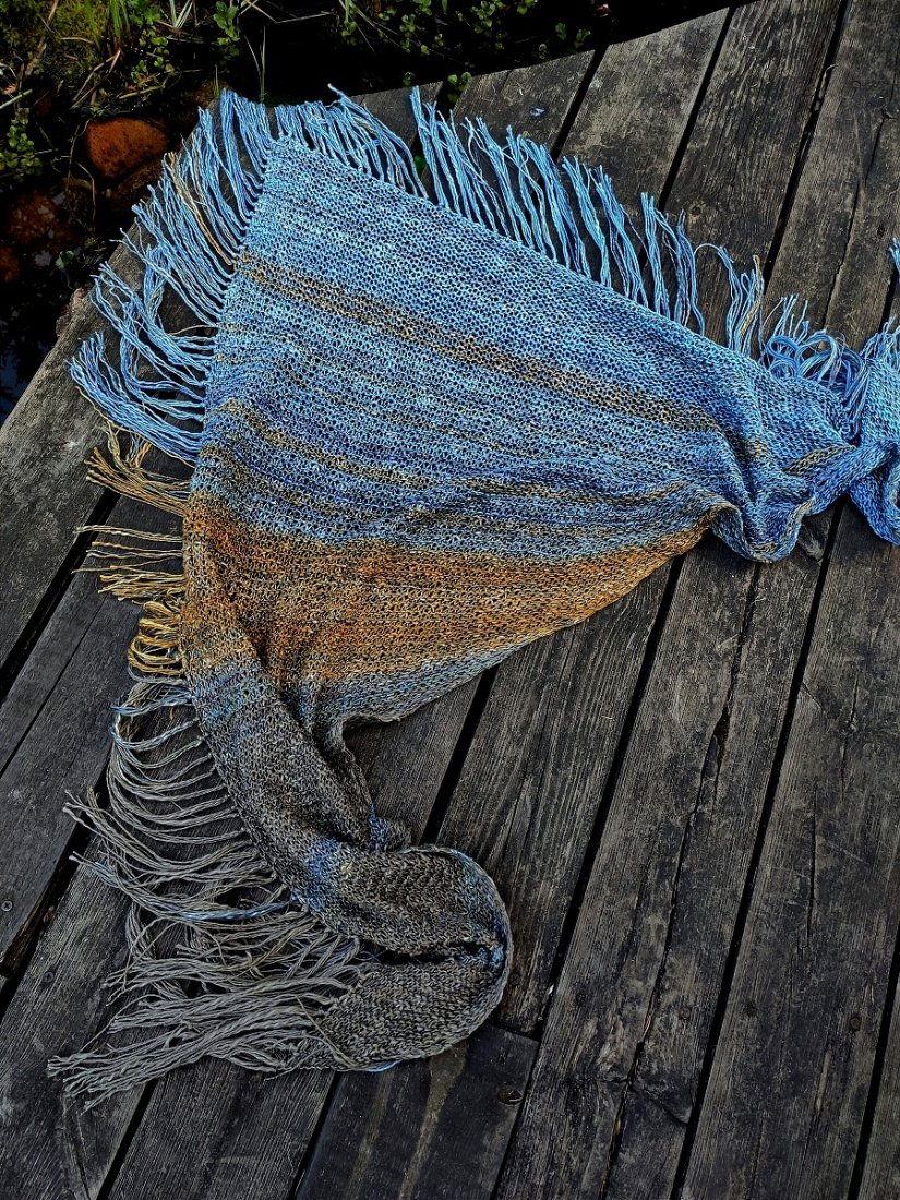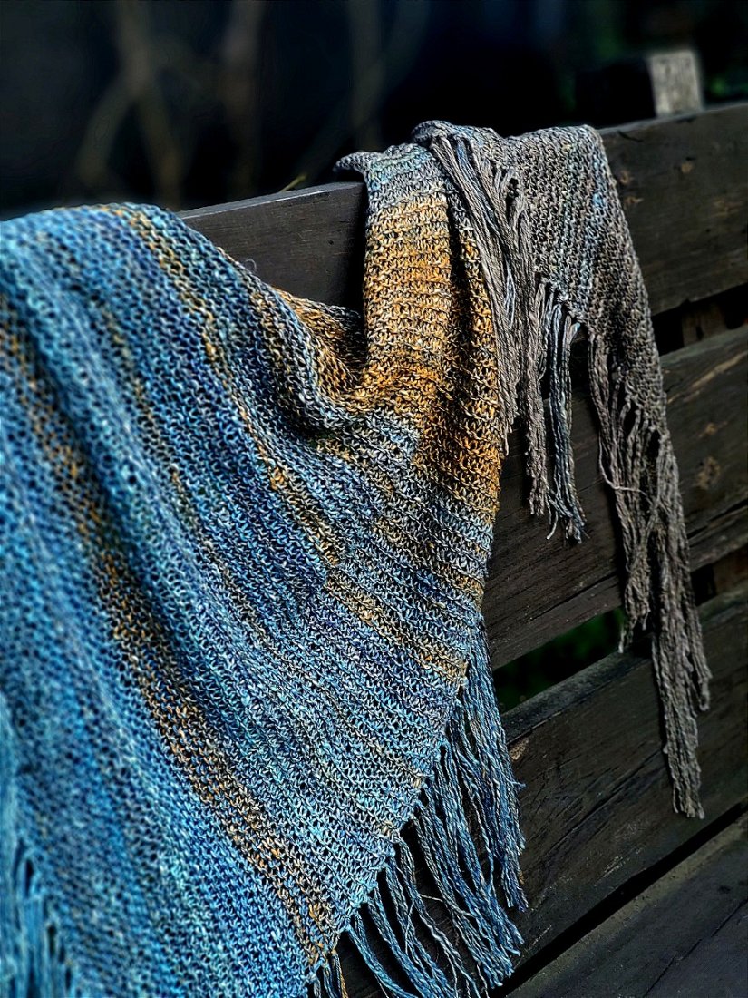 Len, bawełna, wiskoza i merino- świetne na lato, wiosnę- ochrona przed słońcem lub chłodem. Duża chusta wykonana ręcznie na drutach.