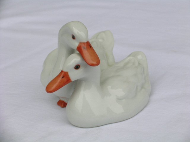 Dawnej daty porcelanowa figurka, sygnowana (także numerycznym tłoczeniem). Fakturowość, ręczne malowanie i błyszczące szkliwienie. Wartościowa; do kolekcji i dla ozdoby. Urzeka kaczą miłością :) 11 x 8 x 7 cm. Stan zachowania bardzo dobry.