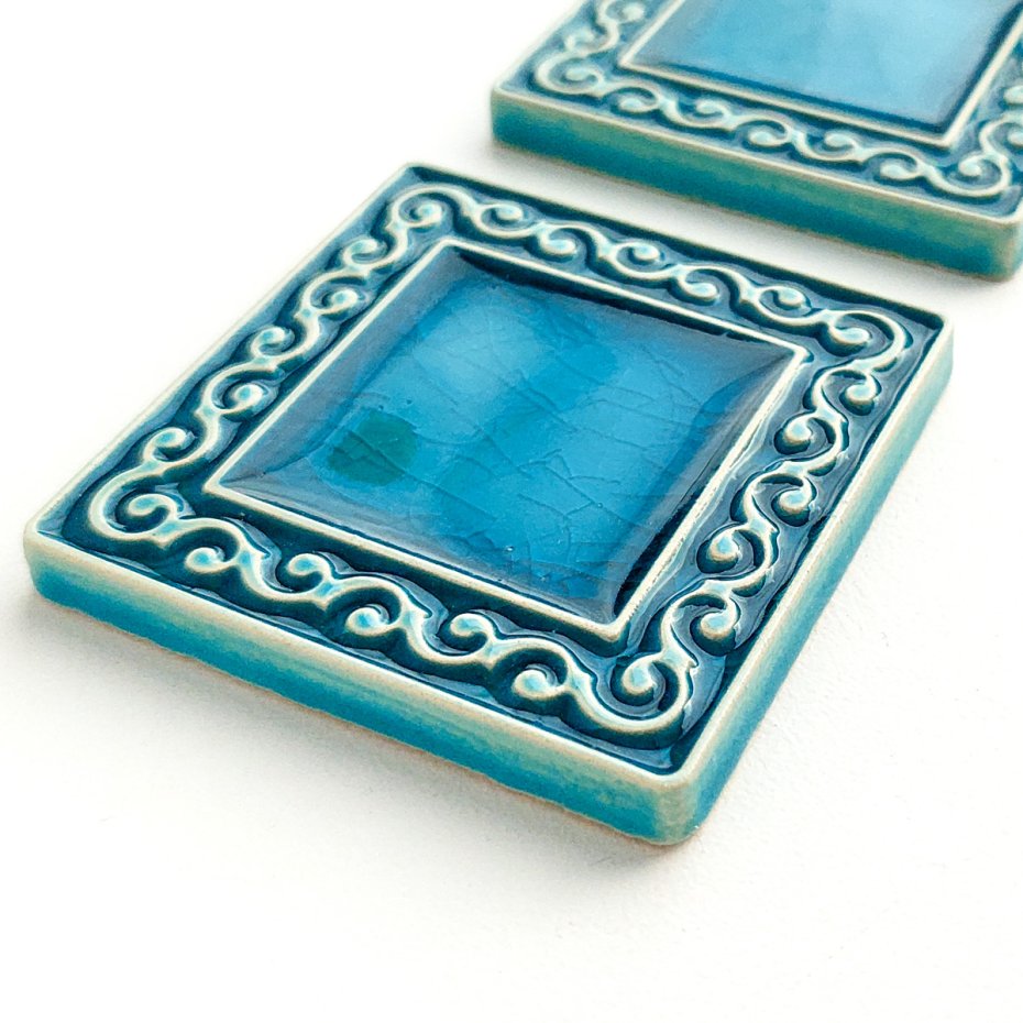 Kafle ceramiczne ręcznie robione, ścienne z lekko wypukłymi, misternymi ornamentami. Wykonane z jasnej gliny, pokryte błyszczącym szkliwem. Dwukrotnie wypalane w wysokiej temperaturze. Odporne na wodę, ścieranie, wysokie i niskie temperatury. Montaż kafli standardowy.
