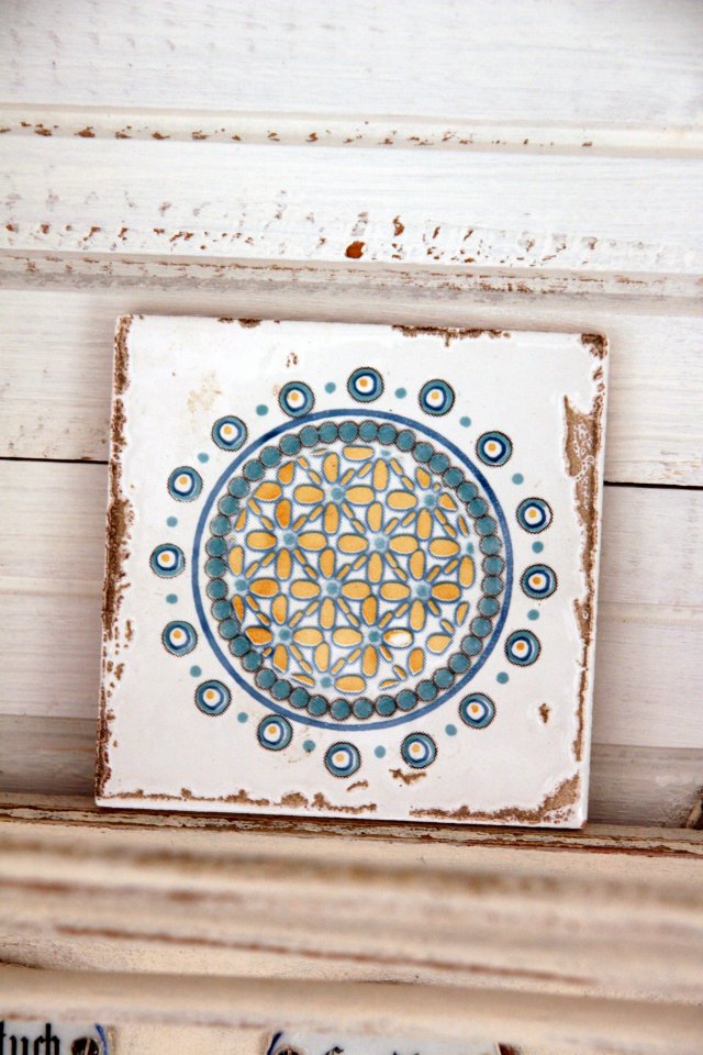 Uroczy, biały ceramiczny kafelek z ciekawym wzorkiem. Może być jako podstawka pod gorący kubek:)