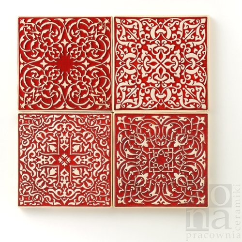 Komplet 4 kafli ceramicznych. Każdy z innym, lekko wypukłym ornamentem. Wykonane z jasnej gliny. Pokryte błyszczącym, efektowym czerwonym szkliwem. Dwukrotnie wypalane. Odporne na ścieranie, wysokie i niskie temperatury. Montaż kafli standardowy. Na zamówienie istnieje możliwość wykonania większej ilości podobnych. Wymiary jednego kafla: 10,3cm x 10,3cm, grubość 0,7cm. Od spodu sygnowane. Cena obejmuje komplet 4 sztuk. Polecam.