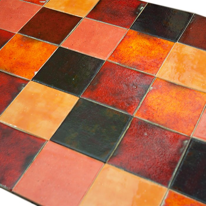 Ręcznie wykonane kafle w odcieniach czerwieni, barwy pomarańczowej i brązowej.