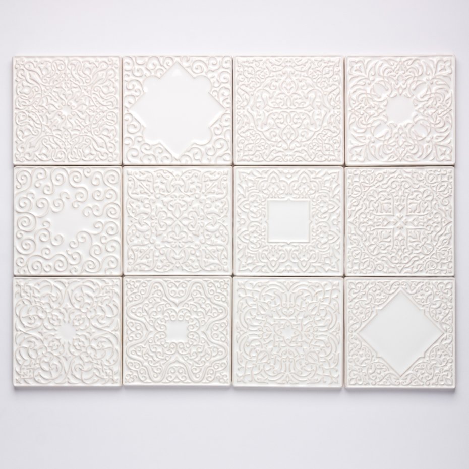 Kafle ceramiczne ręcznie robione, ścienne z lekko wypukłymi, misternymi ornamentami. Zestaw 12 sztuk. Wykonane z jasnej gliny. Pokryte błyszczącym szkliwem, w sposób który odpowiednio podkreśla ozdobny wzór arabeskowej powierzchni. Dwukrotnie wypalane. Odporne na wodę, ścieranie, wysokie i niskie temperatury. Montaż kafli standardowy.