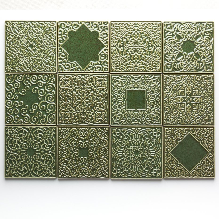 Kafle ceramiczne ręcznie robione, ścienne z lekko wypukłymi, misternymi ornamentami. Zestaw 12 sztuk. Wykonane z jasnej gliny. Pokryte błyszczącym szkliwem, w sposób który odpowiednio podkreśla ozdobny wzór arabeskowej powierzchni. Dwukrotnie wypalane. Odporne na wodę, ścieranie, wysokie i niskie temperatury. Montaż kafli standardowy.