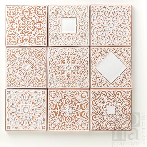 Komplet 9 kafli ceramicznych, każdy z innym, bardzo dekoracyjnym ornamentem. Wykonane z czerwonej gliny, pokryte błyszczącym białym szkliwem, dwukrotnie wypalane. Odporne na ścieranie, wysokie i niskie temperatury. Montaż kafli standardowy. Na zamówienie istnieje możliwość wykonania większej ilości podobnych. Wymiary jednego kafla: 10cm x 10cm, grubość 0,7cm. Każdy kafel posiada zamontowaną z tyłu zawieszkę umożliwiającą zawieszenie na ścianie jak obrazek. Cena obejmuje komplet 9 sztuk. Polecam.