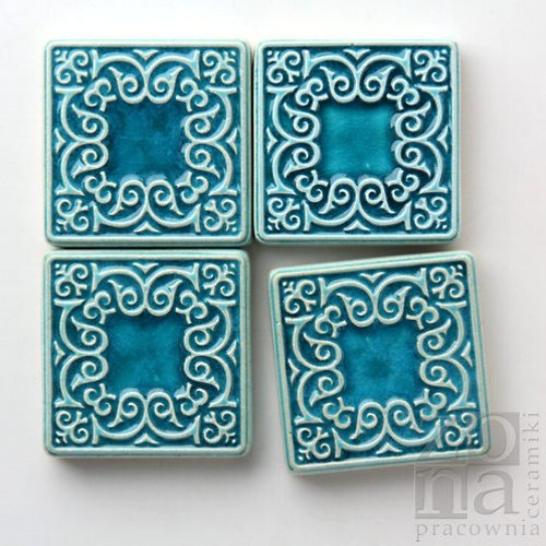 Komplet 4 kafli (dekorów) ceramicznych z ozdobnym ornamentem. Wykonane z jasnej gliny. Pokryte błyszczącym turkusowym szkliwem. Wypalone w temperaturze 1160*C. Odporne na ścieranie, wysokie i niskie temperatury. Montaż kafli standardowy. Na zamówienie istnieje możliwość wykonania większej ilości podobnych. Wymiary jednego kafla: 5cm x 5cm, grubość 0,9cm. Cena obejmuje komplet 4 sztuk. Polecam serdecznie.