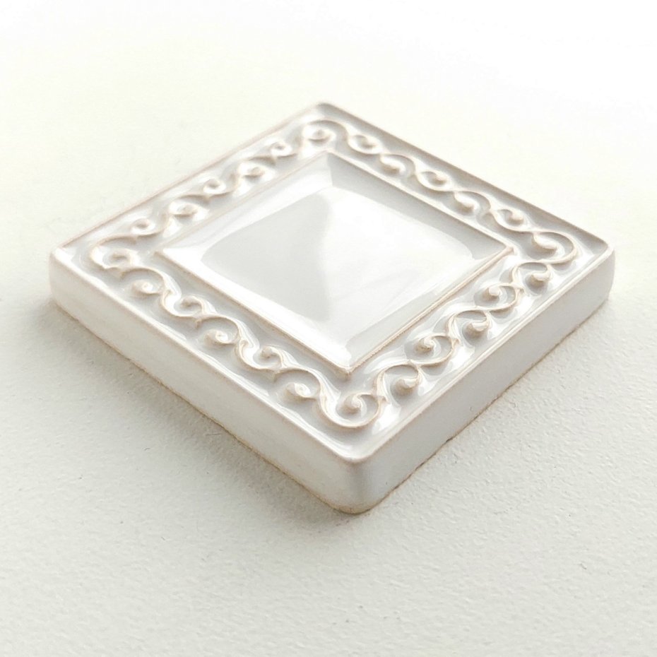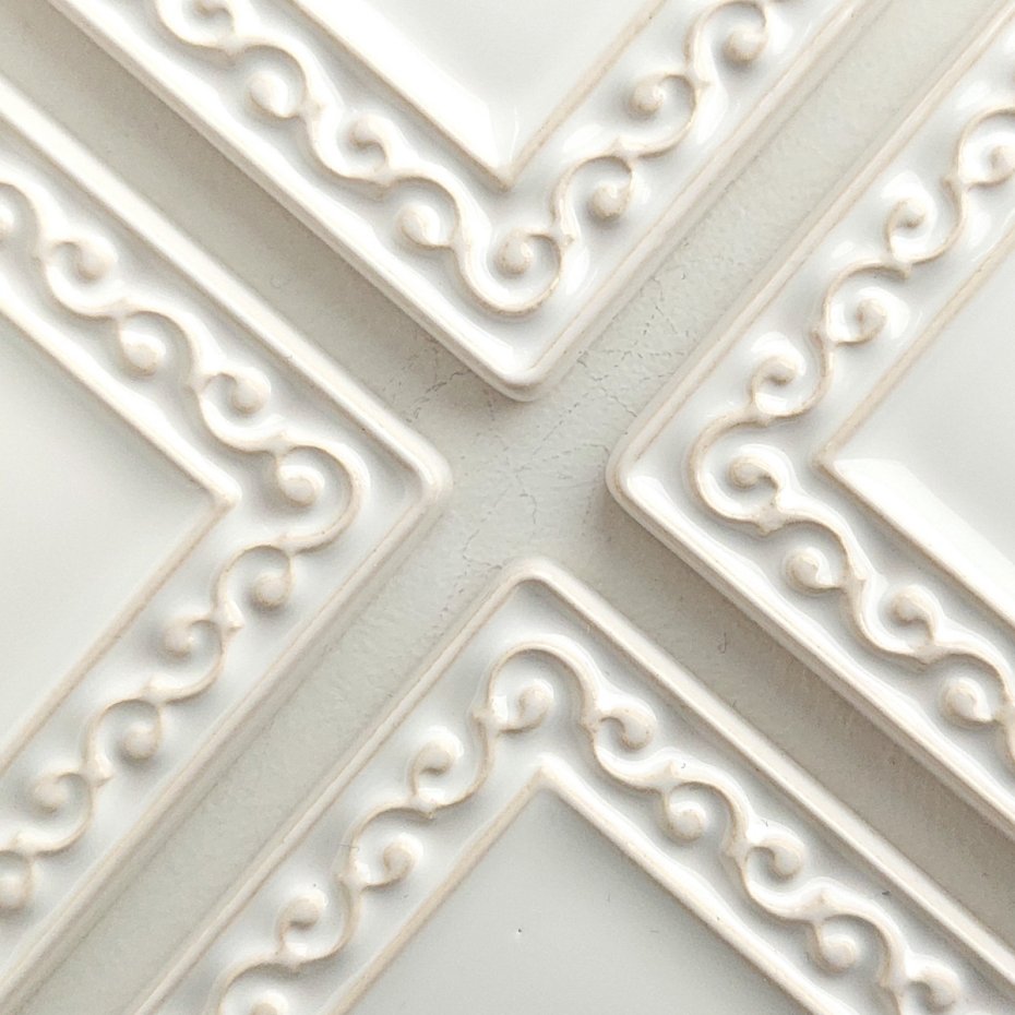 Kafle ceramiczne ręcznie robione, ścienne z lekko wypukłymi, misternymi ornamentami. Wykonane z jasnej gliny, pokryte błyszczącym szkliwem. Dwukrotnie wypalane w wysokiej temperaturze. Odporne na wodę, ścieranie, wysokie i niskie temperatury. Montaż kafli standardowy. Na zamówienie istnieje możliwość wykonania większej ilości podobnych.