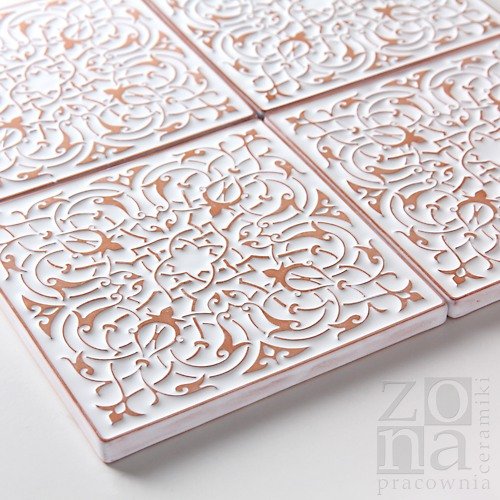 Zestaw 4 kafli ceramicznych z misternym, lekko wypukłym ornamentem. Wykonane z czerwonej gliny, pokryte błyszczącym białym szkliwem, dwukrotnie wypalane w temperaturze 1160*C. Odporne na ścieranie, wysokie i niskie temperatury. Montaż kafli standardowy. Na zamówienie istnieje możliwość wykonania większej ilości podobnych. Wymiary jednego kafla: 14,8 cm x 14,8 cm, grubość 0,9 cm. Cena obejmuje komplet 4 sztuk. Polecam serdecznie.