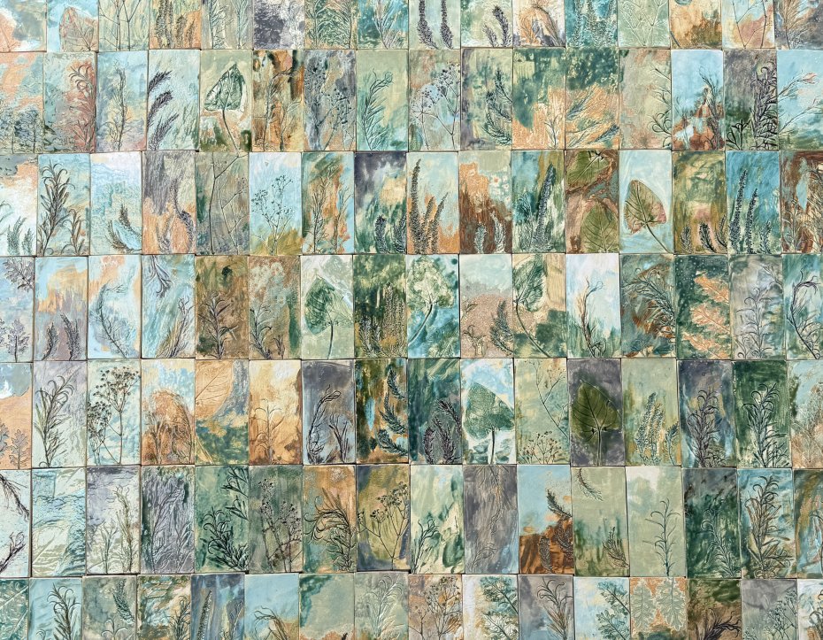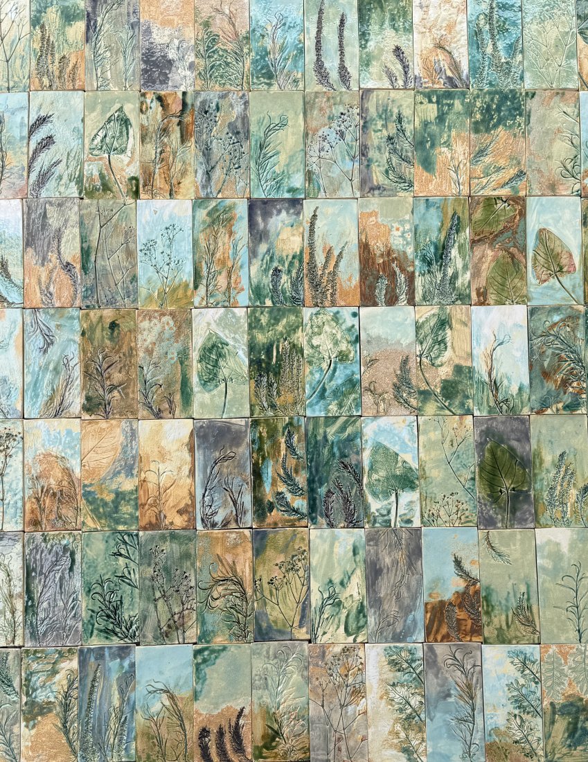 Płytki ceramiczne z odciśniętą naturą.